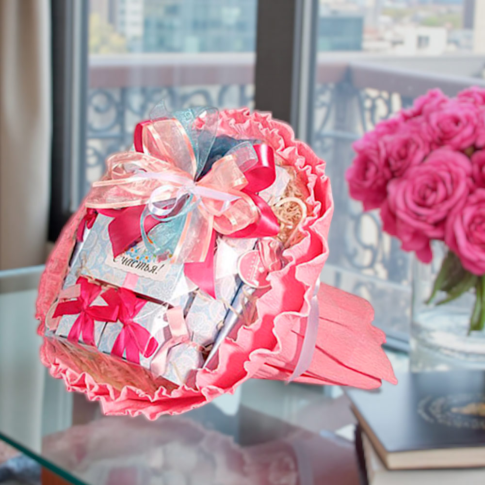 Этот дивный розовый букет - не просто сувенир, а набор изысканных десертов, которые поднимут настроение любому, кому вы их подарите! Ведь букет состоит из самых вкусных лакомств - конфет-суфле и конфет с курагой, финиками, черносливом, глазированных шоколадом.