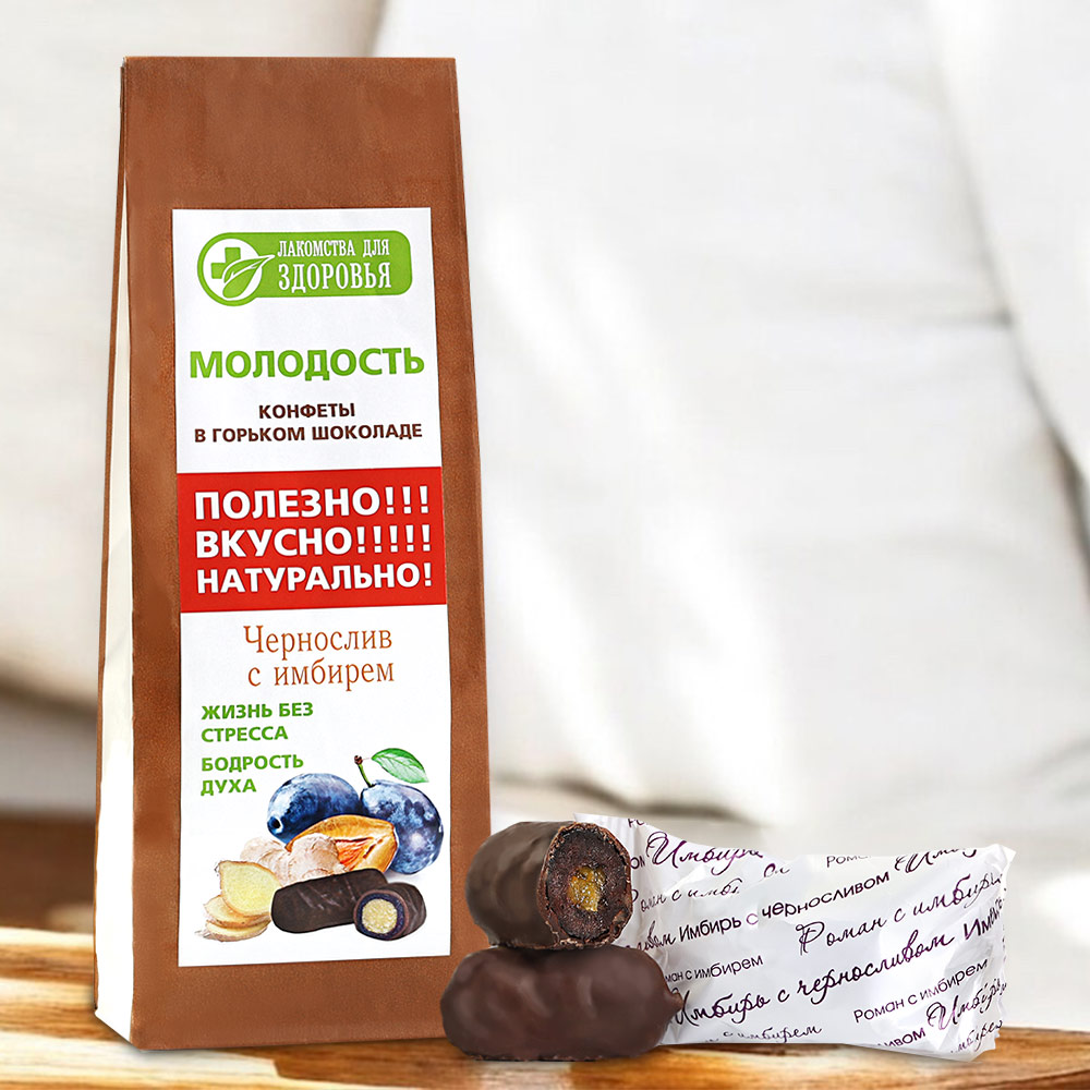 шоколадная масса – какао тертое, сахар, какао-масло, эмульгатор (лецитин соевый), ароматизатор «Ванилин»; начинка – чернослив, цукат имбиря (имбирь сушеный, сахар).