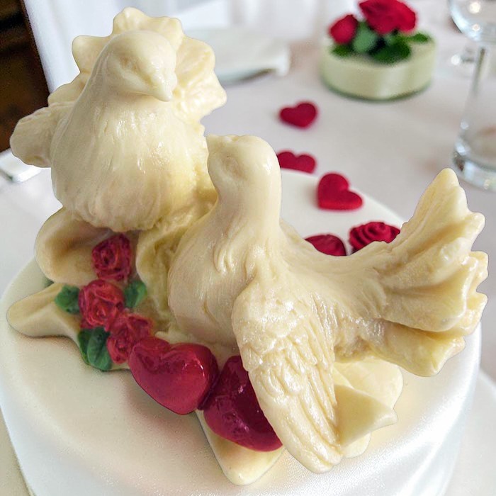 Вкусный и оригинальный подарок для жениха и невесты - съедобная скульптура от “Конфаэль”! Эти голубки выполнены из натурального шоколада.