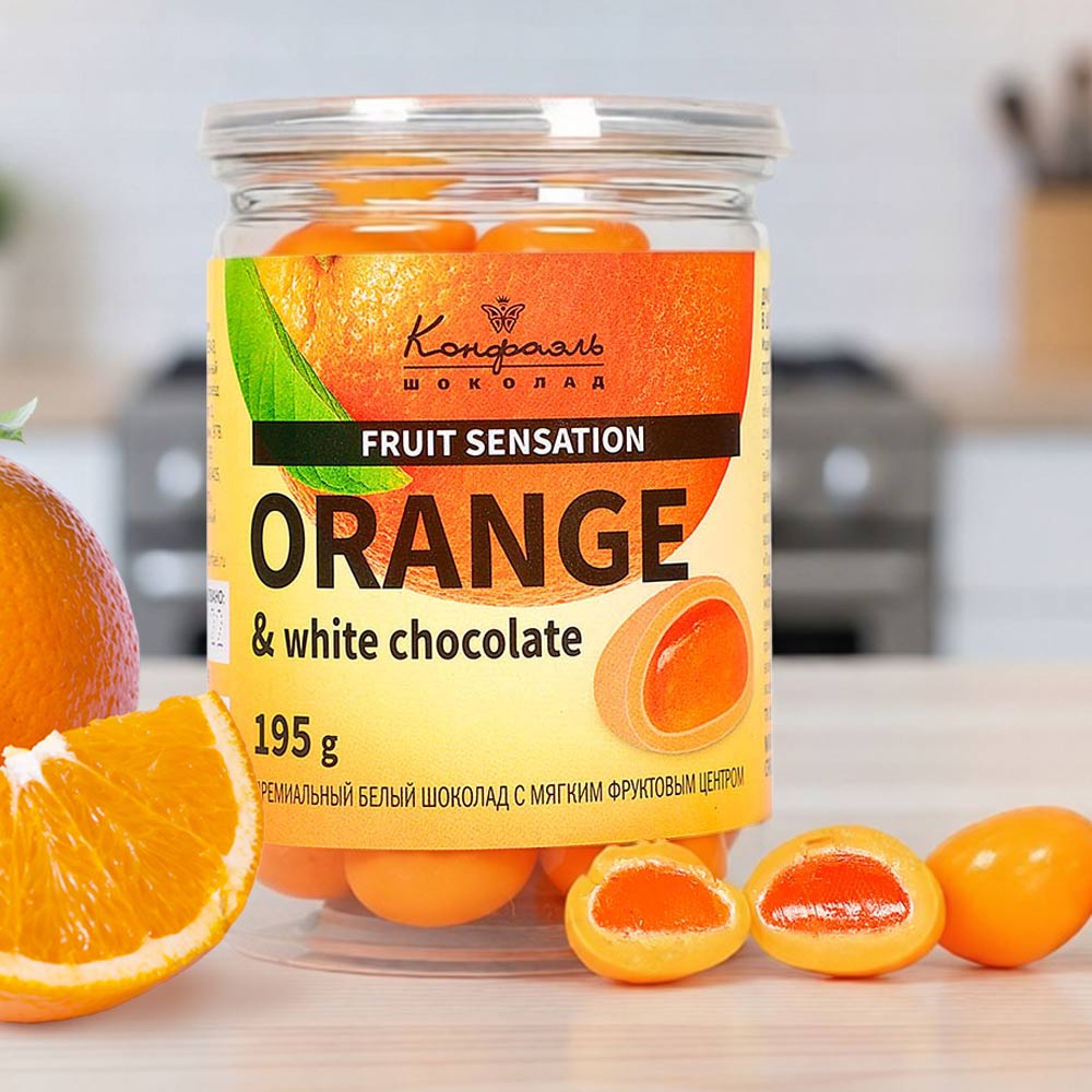 шоколадная масса - какао-масло, сахар, молоко сухое цельное, молоко сухое обезжиренное, лактоза, эмульгатор (лецитин соевый), ароматизатор ("Ванилин"); начинка - сахар, патока, натуральный концентрированный апельсиновый сок, желирующие агенты (агар, желатин говяжий), регулятор кислотности (лимонная кислота), ароматизаторы, пищевой краситель "Паприка", глазирователь (капол).Энергетическая ценность на 100 г продукта: белков – 6,5 г; жиров – 23,0 г; углеводов – 62,0 г 480 ккал/1990 кДж