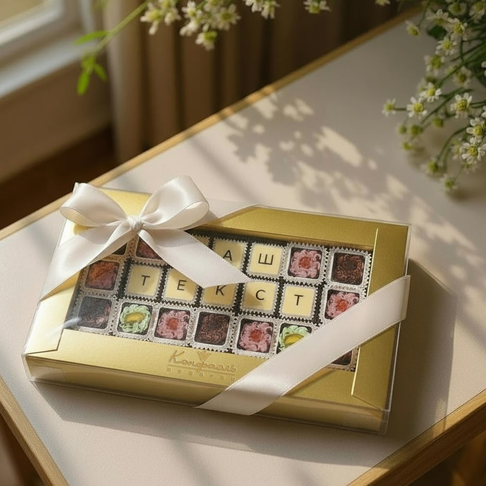 Из ассортимента более 100 шоколадных конфет с изысканными начинками, вы можете собрать индивидуальное шоколадное поздравление на любой праздник.