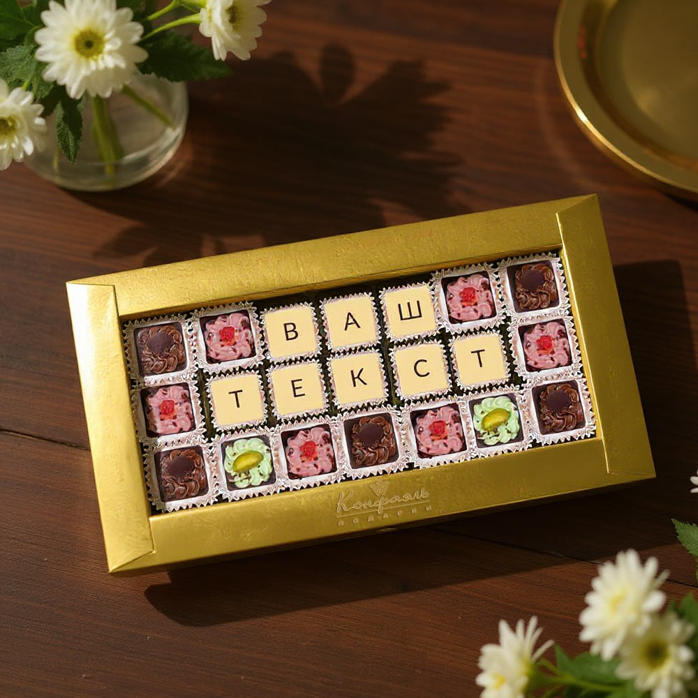 Текст выкладывается съедобной шоколадной мозаикой, которую с удовольствием съест получатель.