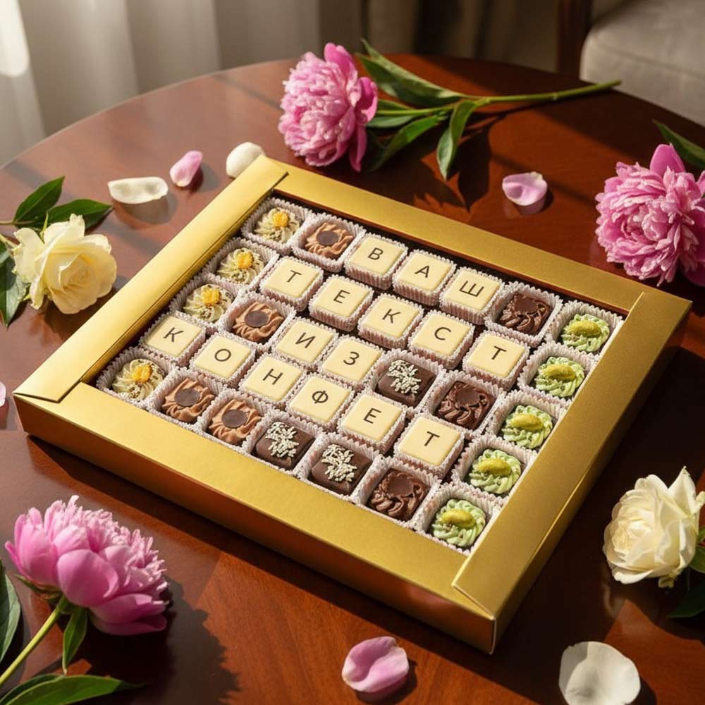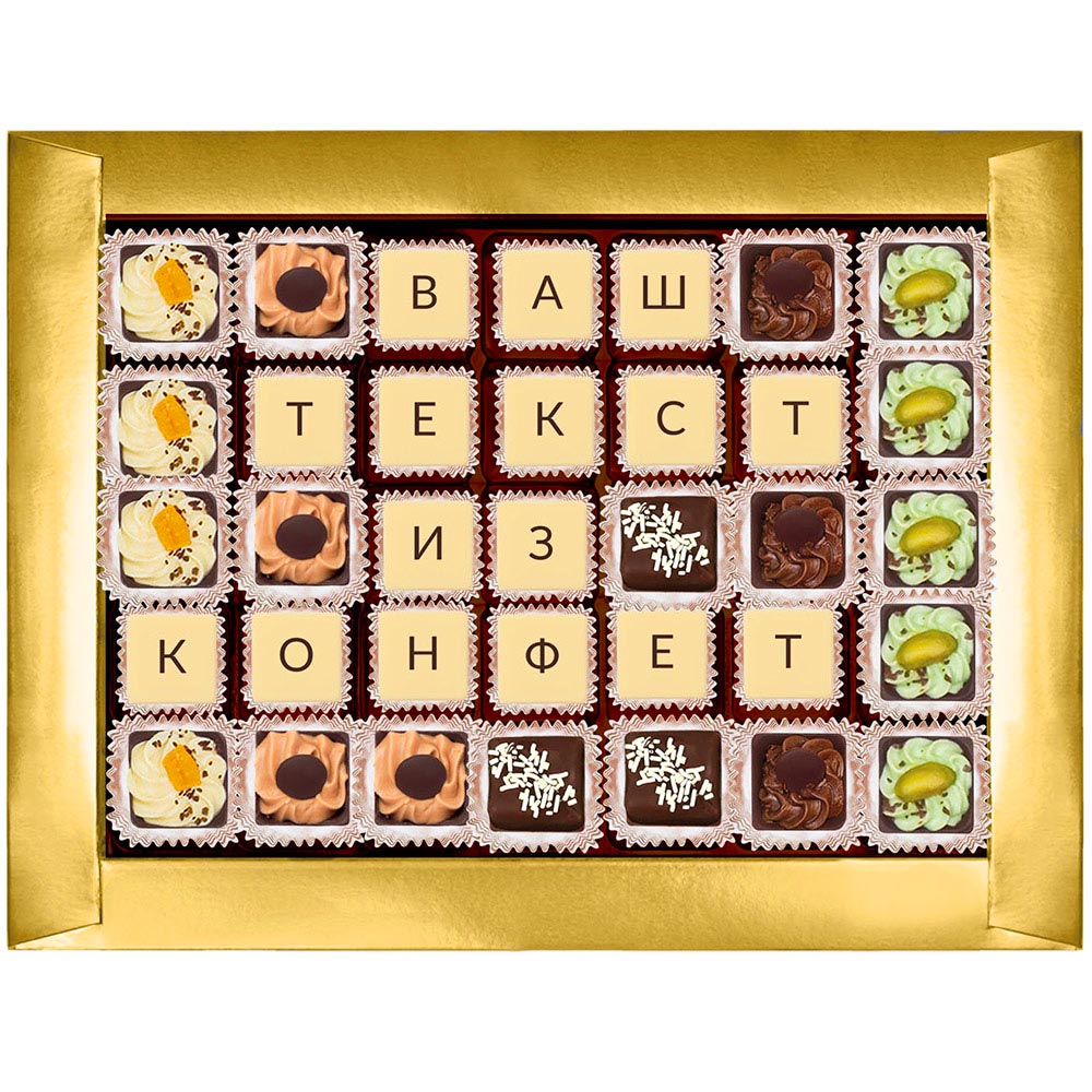 Текст выкладывается съедобной шоколадной мозаикой, которую с удовольствием съест получатель.
