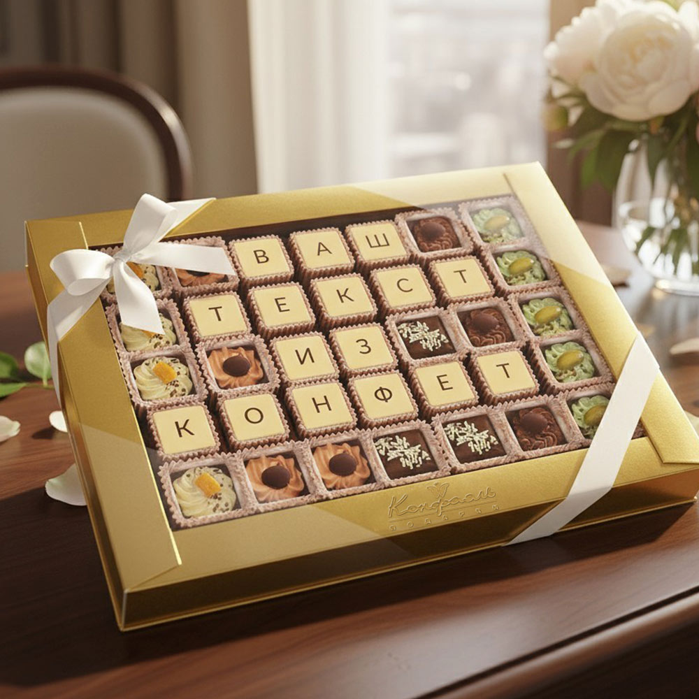 Шокотелеграмма из 48 конфет – это прекрасная возможность поздравить дорогого человека оригинальным способом: шоколадными словами.