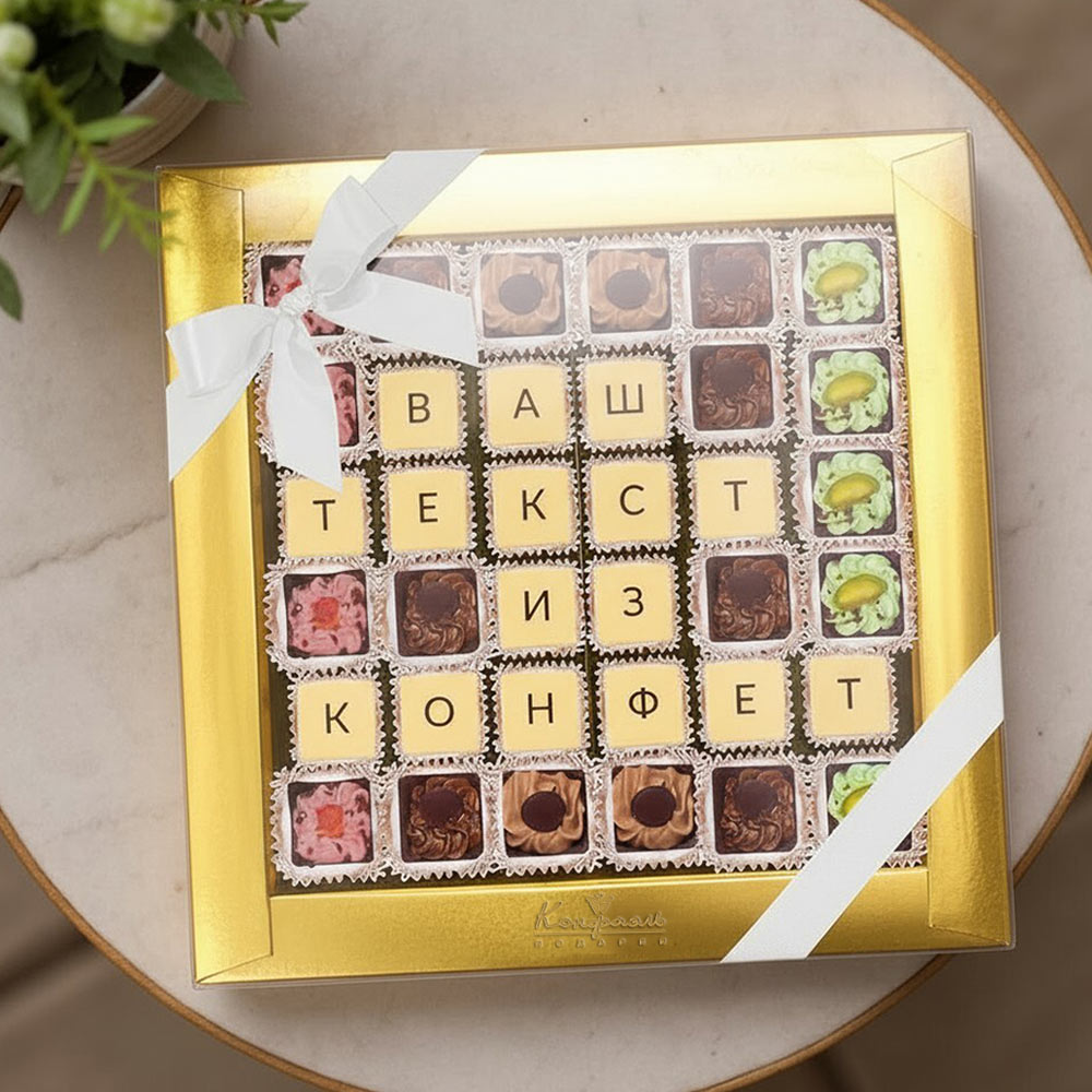 Из ассортимента более 100 шоколадных конфет с изысканными начинками, вы можете собрать индивидуальное шоколадное поздравление на любой праздник.