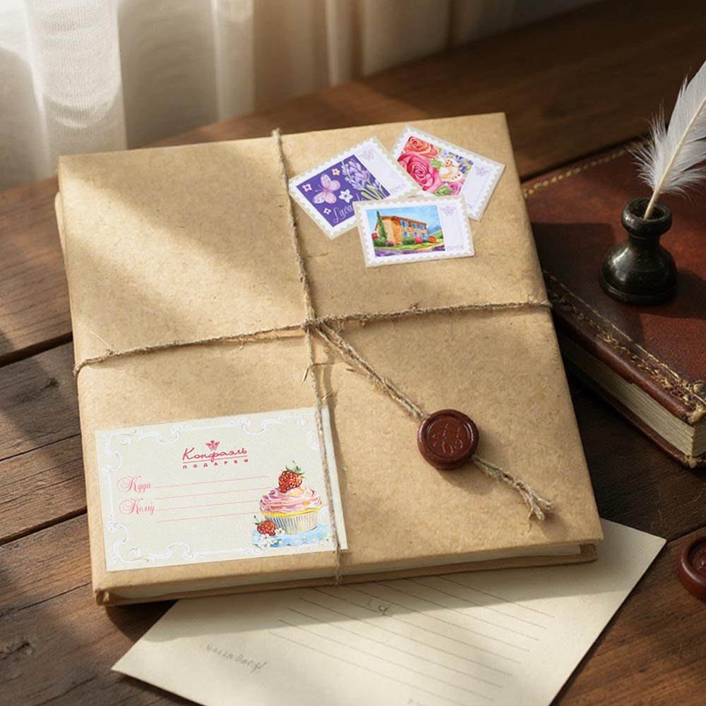 1) В крафтовой бумаге, с оформлением как телеграмма;