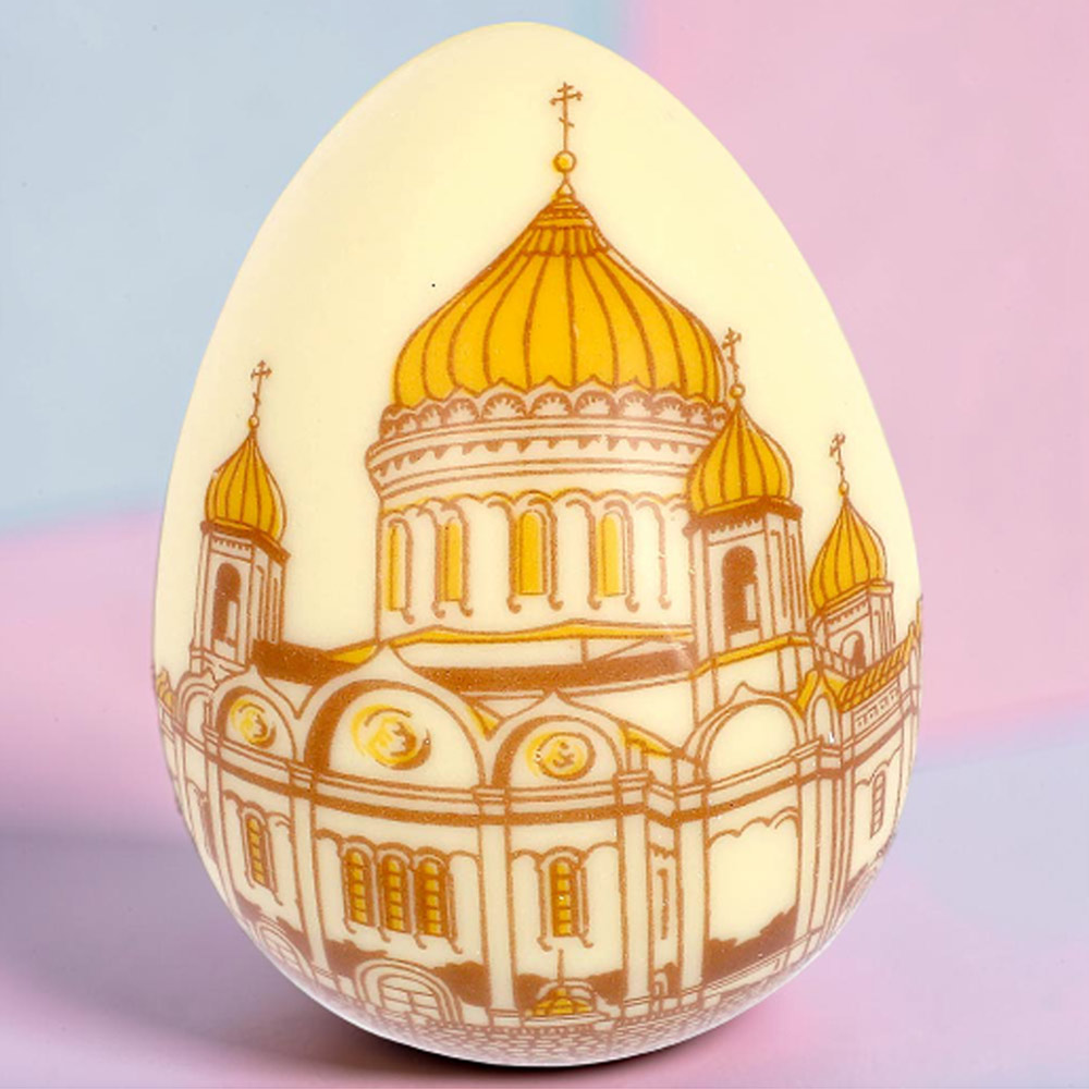 Праздничная упаковка с яйцом из натурального шоколада с изображением храма Христа Спасителя, - идеальный подарок и вкусный десерт для ваших близких и на Пасху, и в качестве сувенира!