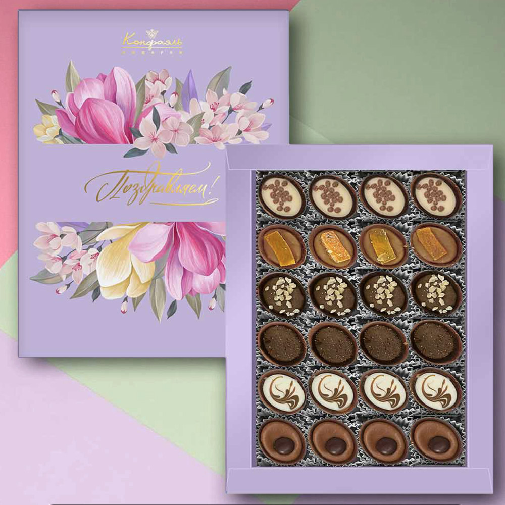 Ищете особенный подарок, который удивит и порадует? Представляем элегантный набор конфет ручной работы в нежной сиреневой гамме — сочетание тонкого вкуса, художественного оформления и душевного тепла.