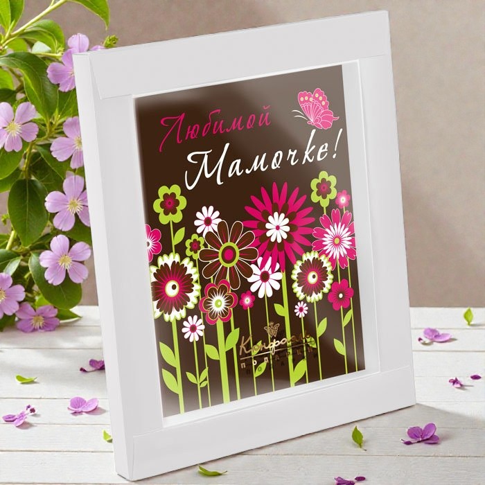 Один из таких деликатесов премиум-класса - это необыкновенно красивая открытка из натурального шоколада «Любимой мамочке!».