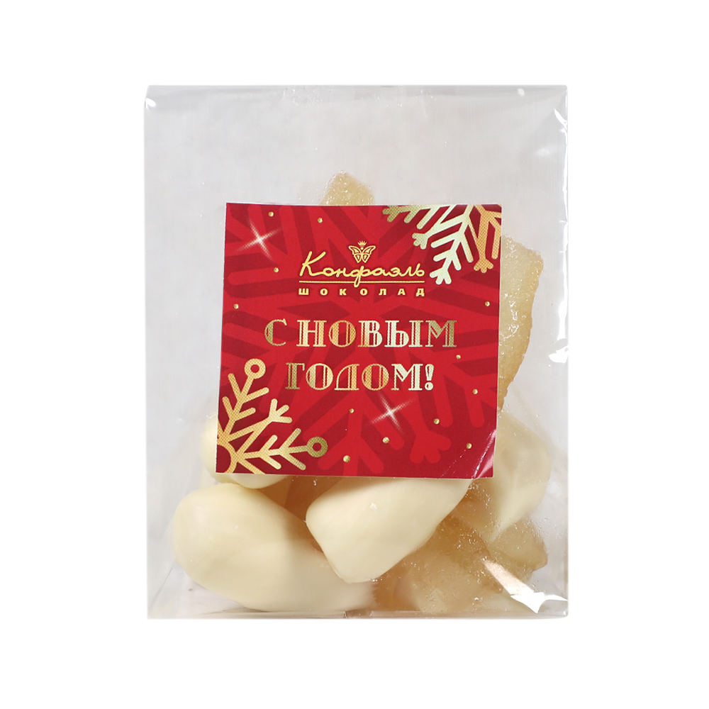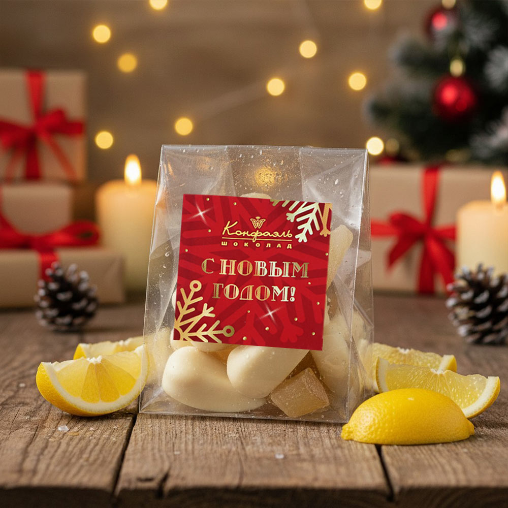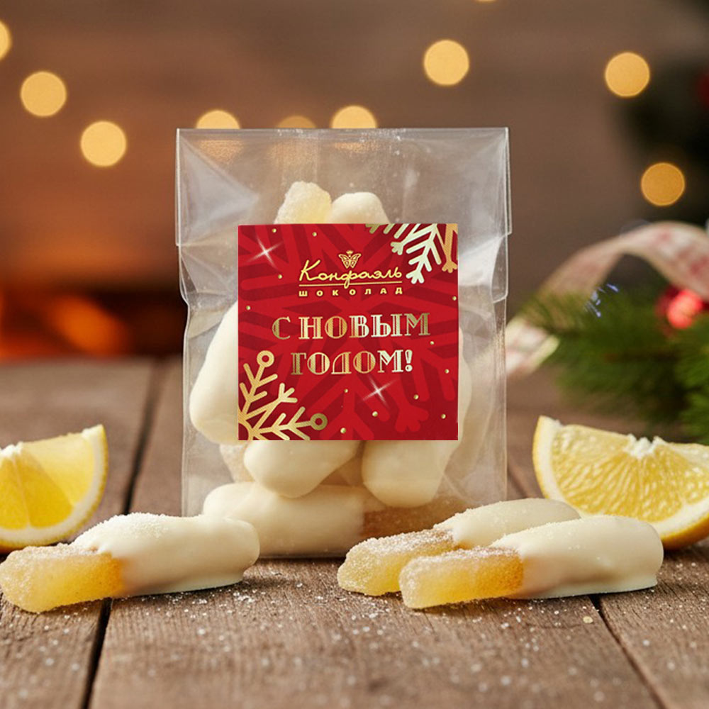 «Любимый вкус» цукаты лимонные корочки в белом шоколаде 50г (красное новогоднее оформление)
