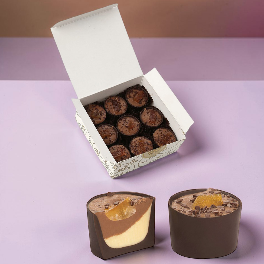 Маэстро-Джандо - шоколадный стаканчик с двухслойной начинкой из апельсиново-шоколадного крема и ореховой массы «Джандуйя», украшенная цукатом из апельсиновой корочки