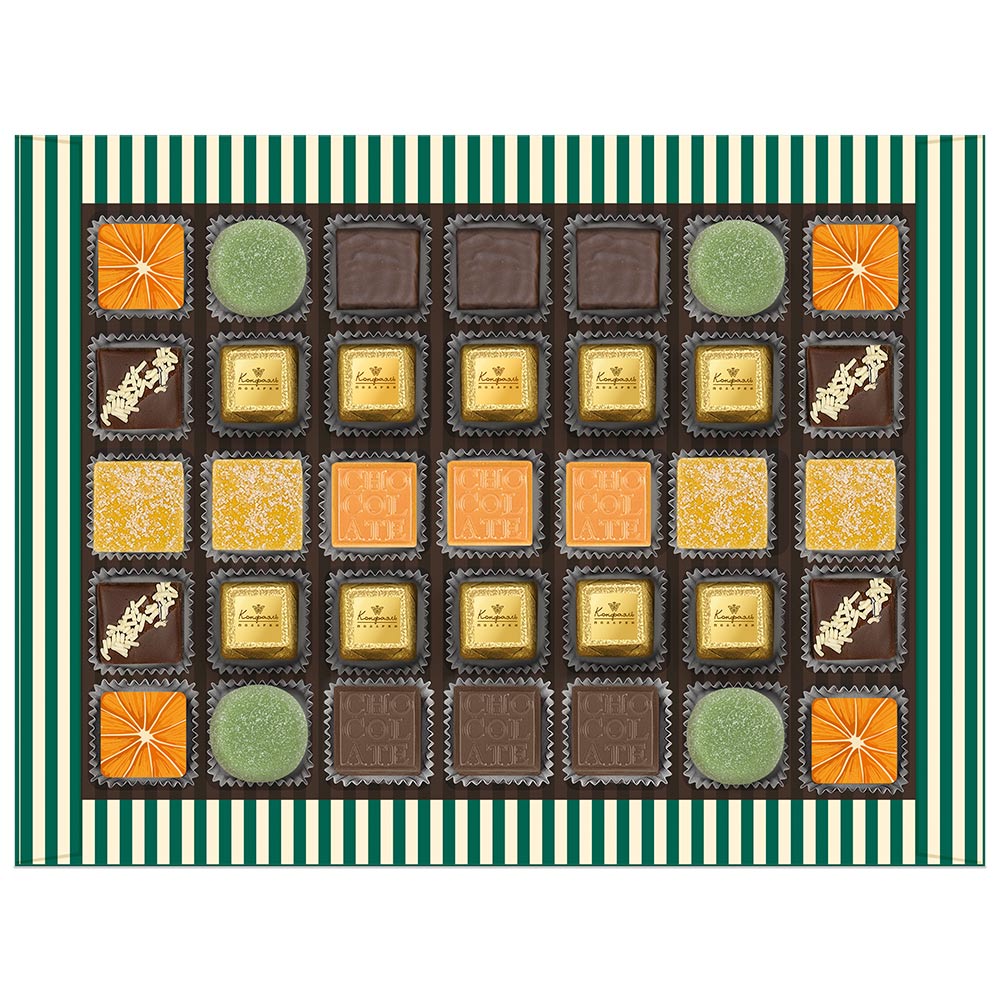 Состав: шоколадные массы -сахар, масло какао, молоко цельное сухое, сухое обезжиренное молоко, какао тертое, какао-порошок, сыворотка молочная сухая, пахта сухая, молочный жир, паста ореховая из ядер фундука, эмульгаторы (соевый лецитин, Е476), соль, натуральная ваниль, ароматизаторы; начинки - сахар, патока, какао-масло, какао тертое, молоко сгущенное (молоко цельное, сахар (сахароза, лактоза)), масла растительные рафинированные дезодорированные (подсолнечное, рапсовое, оливковое; масло сладко-сливочное, молоко сухое обезжиренное), масло сладко - сливочное, белок яичный порошкообразный, натуральные концентрированный апельсиновый сок, клубника сушеная, кумкват сушеный, цукаты лимонных корочек, папайя сушеная, ананас сушеный, финики, чернослив, абрикос сушеный, ядра орехов фундука, ядра орехов миндаля, вафельная крошка( мука пшеничная х/п первого сорта, сахар, масло кокосовое рафинированное дезодорированное, эмульгатор( лецитин соевый), пшеничные волокна (клетчатка), ароматизатор), стабилизатор (мальтодекстрин), желирующий агент (агар), коньяк (дистиллят коньячный, вода, сахар, пищевой краситель (сахарный колер)), спирт этиловый ректификованный, консервант (сорбиновая кислота), регулятор кислотности (лимонная кислота), эмульгаторы (лецитин соевый, Е471), сухой сок апельсина, сухой сок моркови, экстракт маракуйи, ароматизаторы, пищевые красители (сахарный колер, Е171, медные комплексы хлорофиллов и хлорофиллинов); декор - пищевые красители (Е172, Е171, паприка)