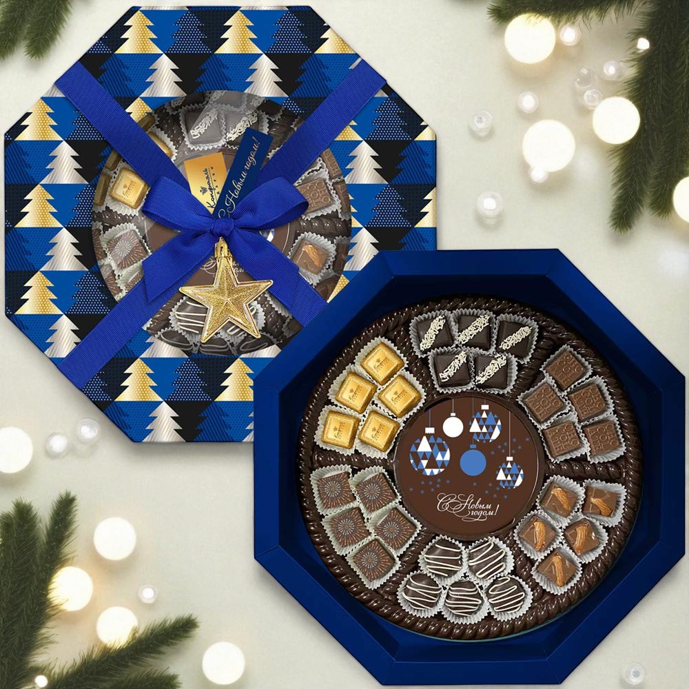 Шоколад молочный с декором, шоколад молочный с миндалем, шоколадные конфеты «Ассорти» с кремовой и сливочной начинками, с кремовой начинкой и декором, конфеты «Мягкий грильяж» в горьком шоколаде, конфеты «Желейные» в горьком шоколаде (апельсиновые)
