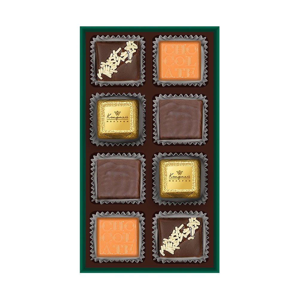 Конфеты «Мягкий грильяж» в горьком шоколаде, ассорти- сливочная начинка Манго-Маракуйя, конфеты «ассорти» со сливочными начинками( золотая фольга), суфле в горьком шоколаде (апельсиновое)