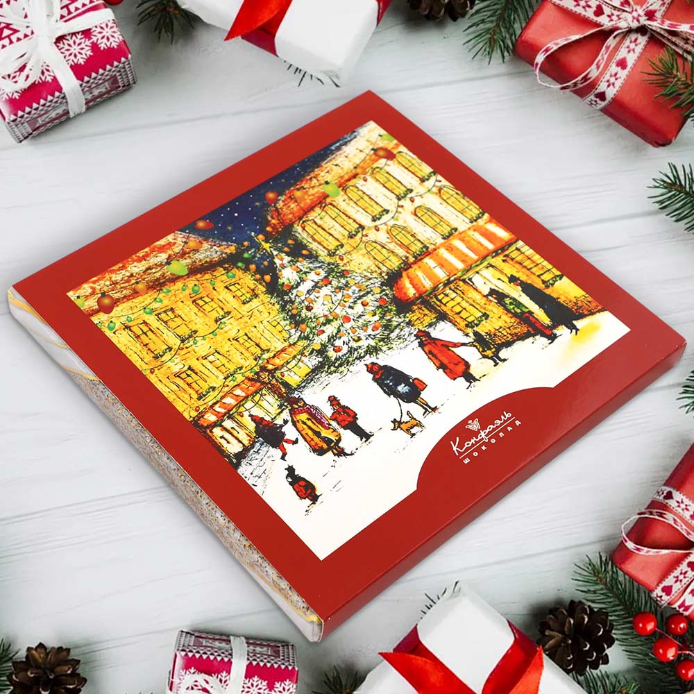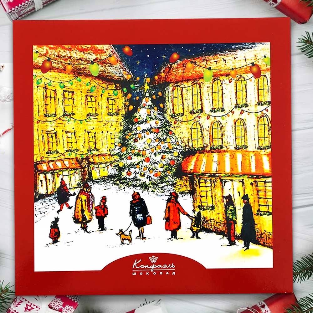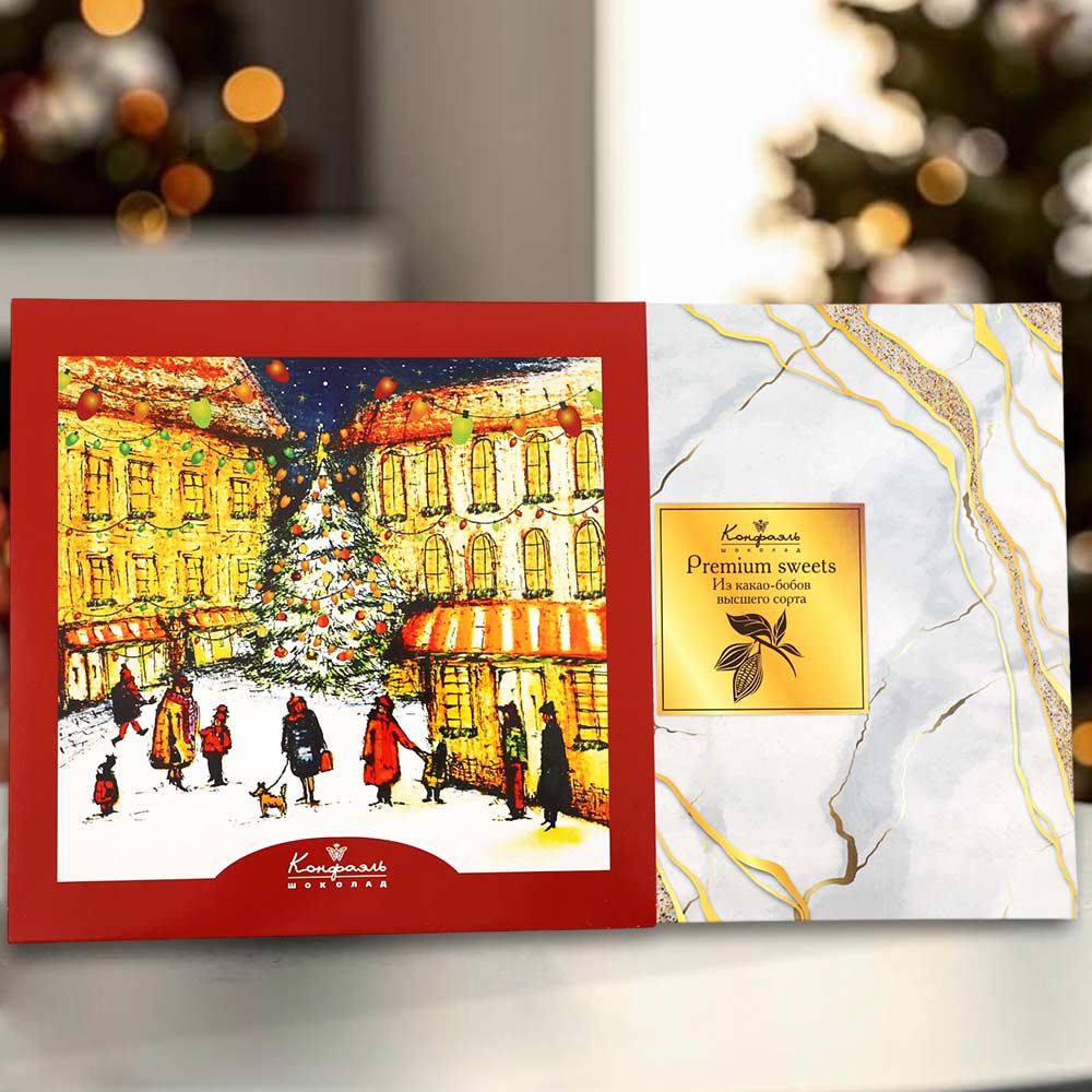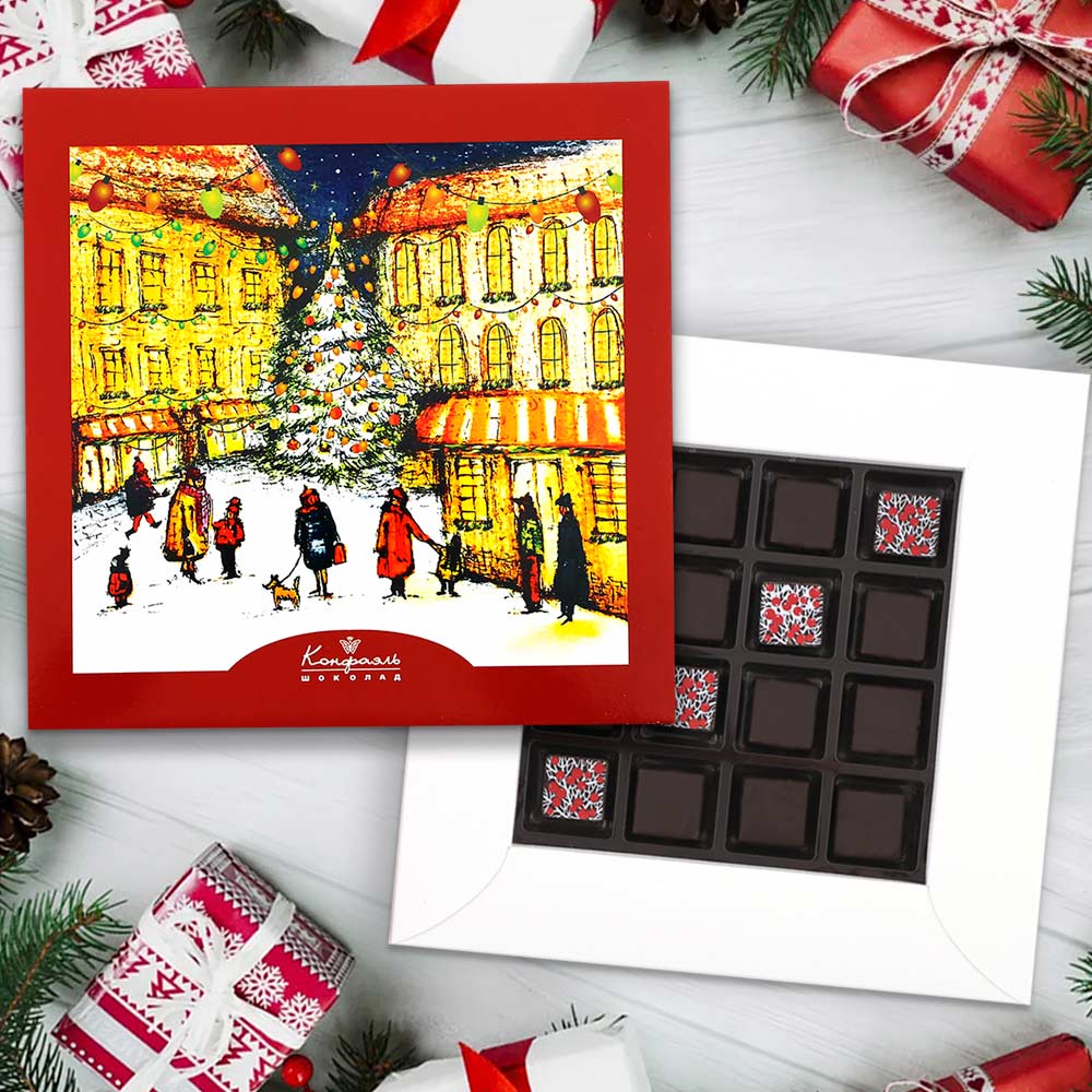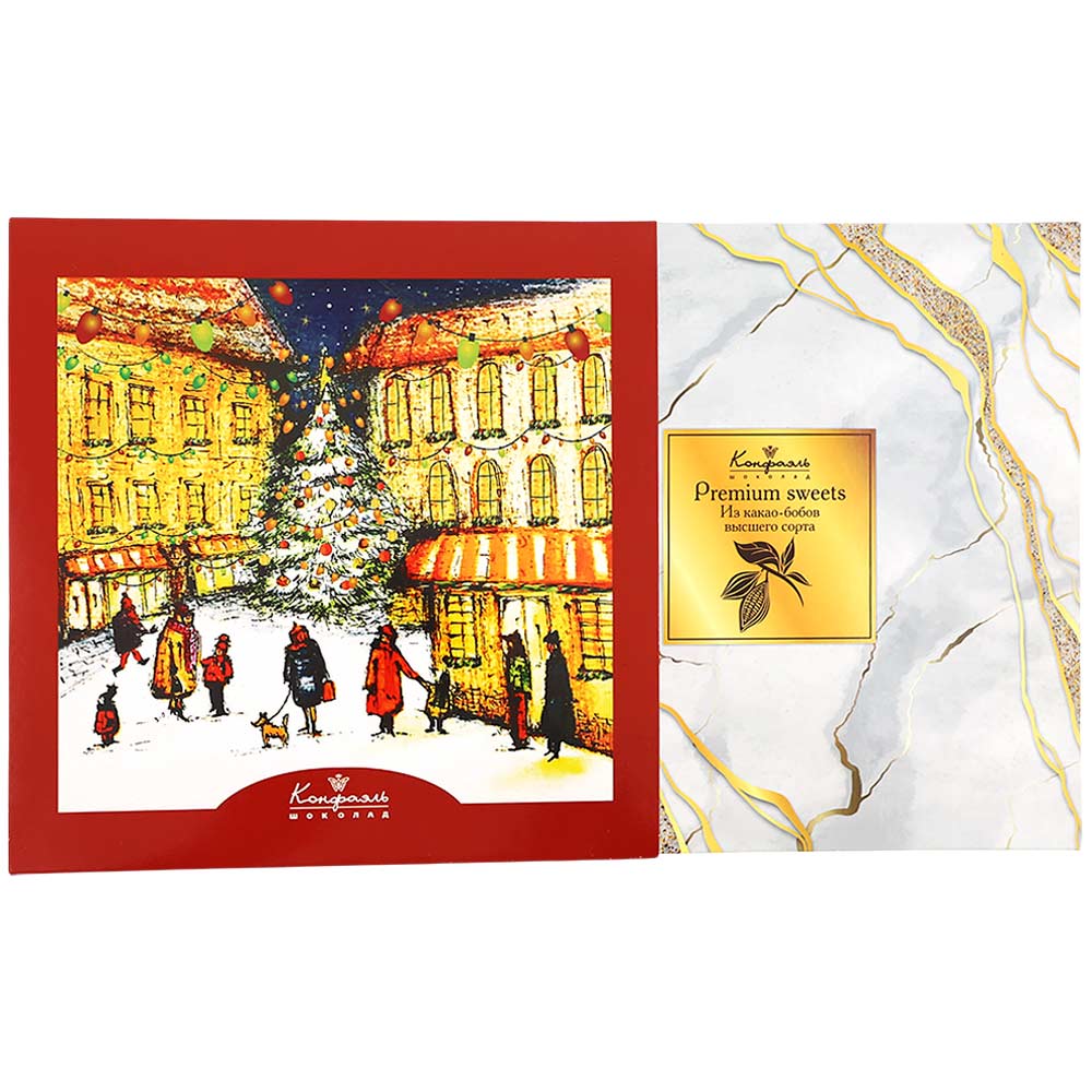 Состав: шоколадная масса -сахар, какао тертое, масло какао, какао-порошок, эмульгаторы (соевый лецитин, Е476); начинки - сахар, патока, молоко сгущенное (молоко цельное, сахар (сахароза, лактоза)), масло сладко-сливочное, белок яичный порошкообразный, натуральный концентрированный лимонный сок, стабилизатор (гуммиарабик), желирующий агент (агар), спирт этиловый ректификованный, консервант (сорбиновая кислота), регулятор кислотности (лимонная кислота), экстракт ванили, ароматизатор; декор - пищевые красители (Е171, красный свекольный )