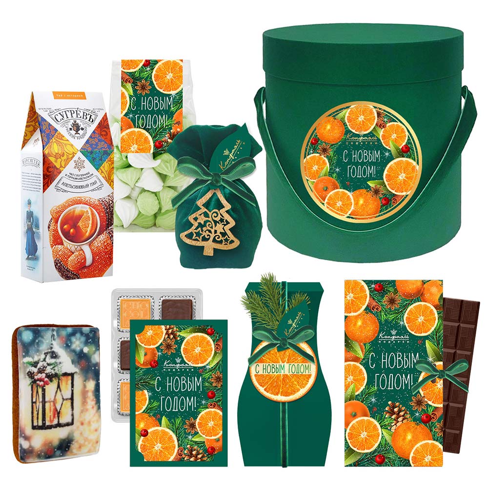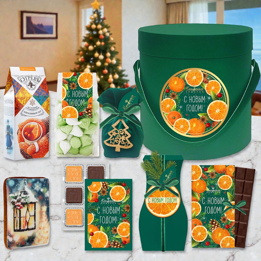 Новогодний набор с конфетами и шоколадом: мармелад-суфле, драже, ассорти, пряник, чай 555г