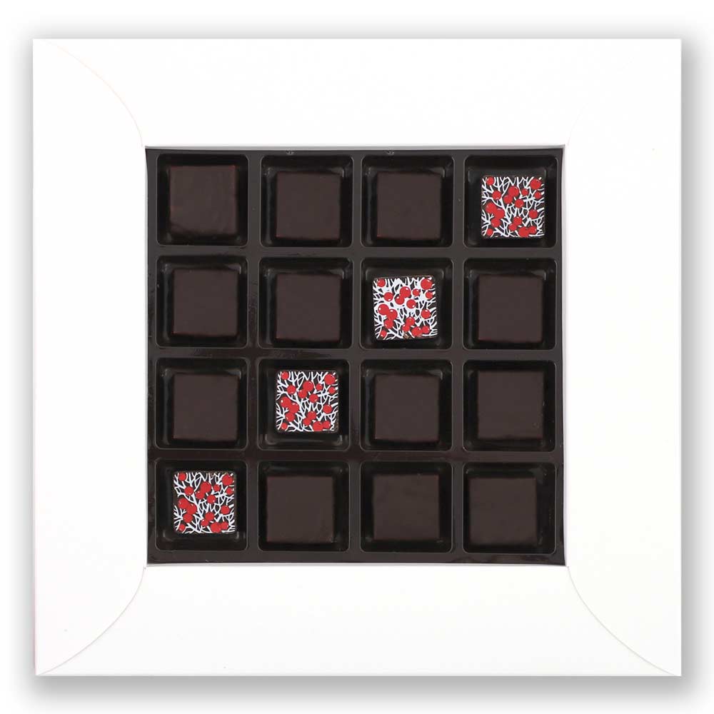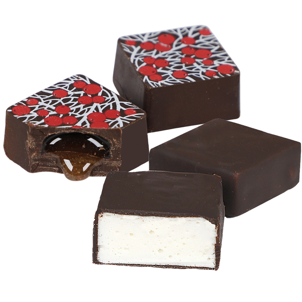 Состав: шоколадная масса - сахар, тертое какао, масло какао, какао-порошок, эмульгатор (лецитин соевый), натуральная ваниль; начинки - сахар, патока, молоко сгущенное (молоко цельное, сахар (сахароза, лактоза)), масло сладко-сливочное, белок яичный порошкообразный, натуральный концентрированный лимонный сок, стабилизатор (гуммиарабик), желирующий агент (агар), спирт этиловый ректификованный, консервант (сорбиновая кислота), регулятор кислотности (лимонная кислота), экстракт ванили, ароматизатор; декор - пищевые красители (Е171, свекольный концентрат)
