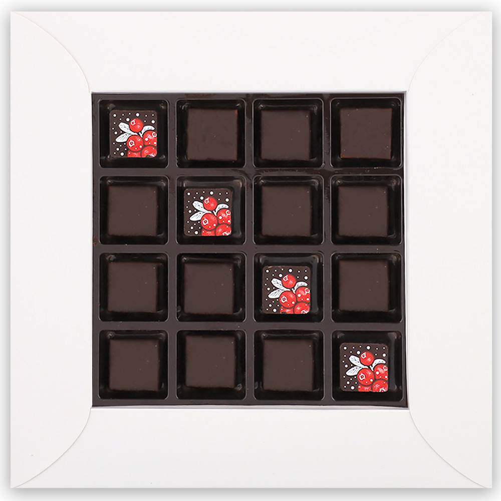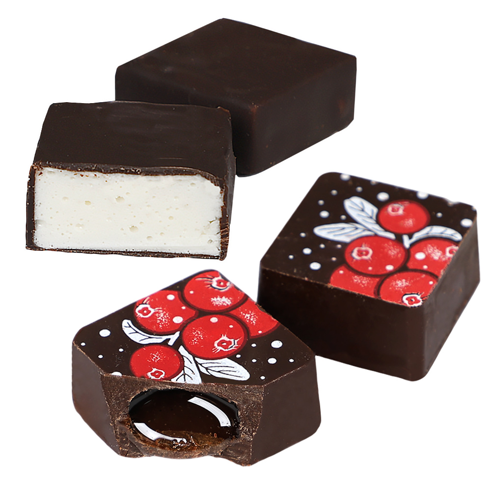Состав: шоколадная масса - сахар, тертое какао, масло какао, какао-порошок, эмульгатор (лецитин соевый), натуральная ваниль; начинки - сахар, патока, молоко сгущенное (молоко цельное, сахар (сахароза, лактоза)), масло сладко - сливочное, белок яичный порошкообразный, натуральный концентрированный клюквенный сок, стабилизатор (гуммиарабик), желирующий агент (агар), спирт этиловый ректификованный, консервант (сорбиновая кислота), регулятор кислотности (лимонная кислота), экстракт ванили, ароматизатор; декор - пищевые красители (Е171, свекольный концентрат) Продукция производится на предприятии, где используются арахис, кунжут, орехи, яичные и молочные продукты, злаки, содержащие глютен.