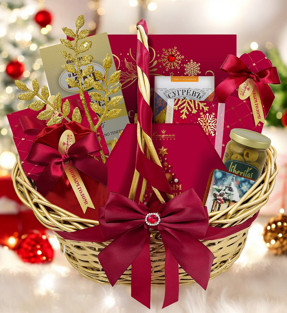 "Новогодняя корзина": шоколад, драже, конфеты, риет, мед, чай 1665г