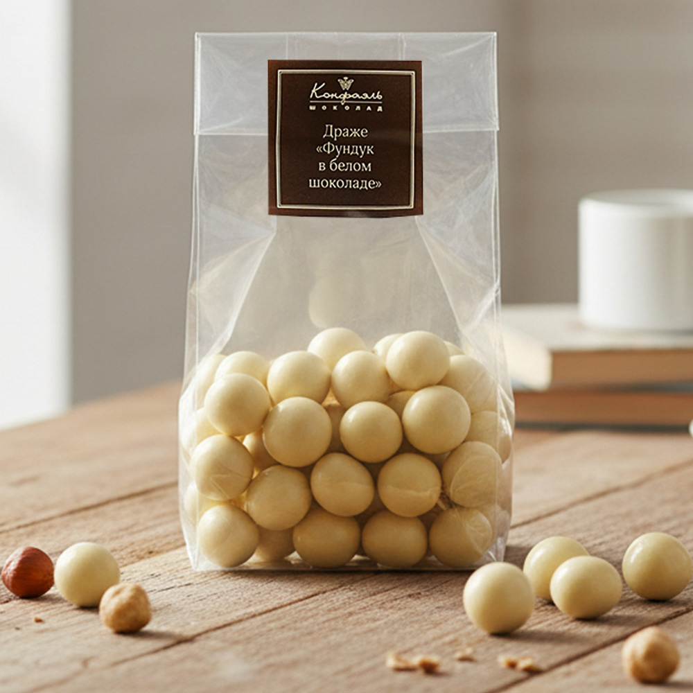 Прозрачная упаковка, не скрывающая своё соблазнительное содержимое - драже Фундук в белом шоколаде, - желанный подарок для ваших близких. Порадуйте же их поскорее!