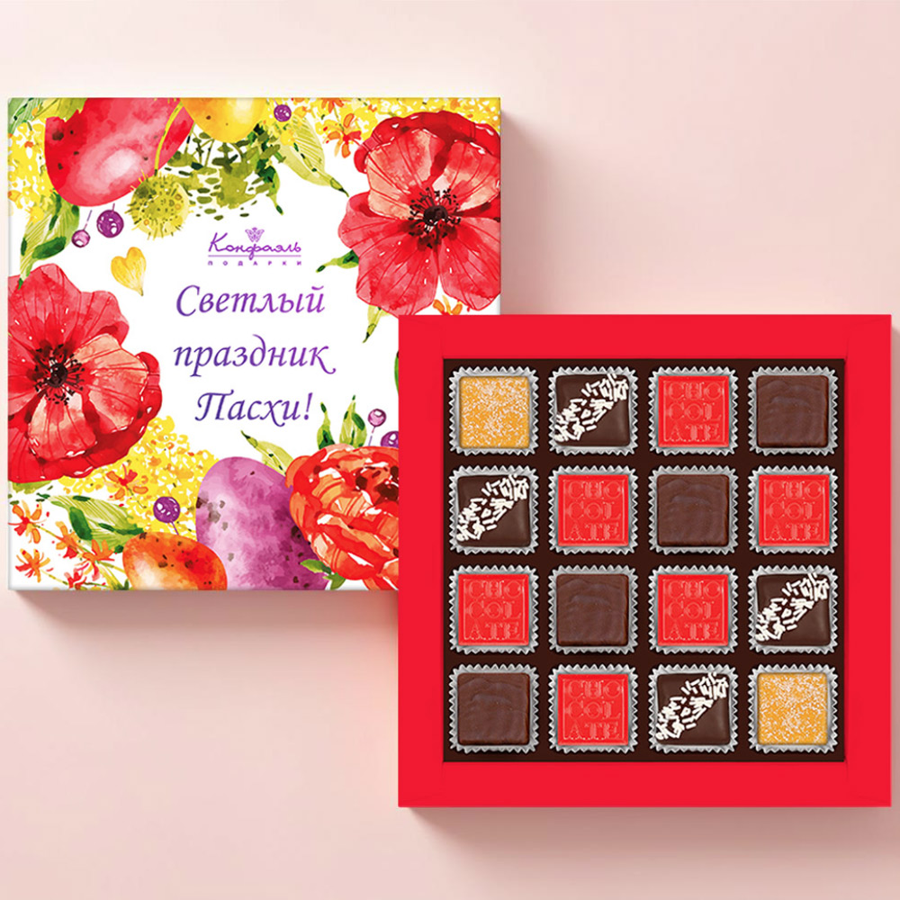 Состав: шоколадные массы -сахар, тертое какао, какао-порошок, масло какао, сухое обезжиренное молоко, сухое цельное молоко, пахта сухая, эмульгатор (лецитин соевый), соль, натуральная ваниль; начинки - сахар, патока, какао-масло, какао тертое, молоко сгущенное (молоко цельное, сахар (сахароза, лактоза)), масла растительные рафинированные дезодорированные (подсолнечное, рапсовое, оливковое; масло сладко-сливочное, молоко сухое обезжиренное), масло сладко - сливочное, белок яичный порошкообразный, натуральный концентрированный апельсиновый сок, цукаты апельсиновых корочек, папайя сушеная, ананас сушеный, финики, чернослив, абрикос сушеный, ядра орехов фундука, ядра орехов миндаля, стабилизатор (мальтодекстрин), желирующий агент (агар), желатин говяжий, коньяк (дистиллят коньячный, вода, сахар, пищевой краситель (сахарный колер)), спирт этиловый ректификованный, консервант (сорбиновая кислота), регулятор кислотности (лимонная кислота), эмульгаторы (лецитин соевый, Е471), ароматизаторы, пищевые красители (сахарный колер, красный свекольный). Внимание! В продукте возможно наличие фрагментов фруктовых косточек (кураги натуральной, фиников натуральных, чернослива натурального). Продукция производится на предприятии, где используются арахис, кунжут, орехи, яичные и молочные продукты, злаки, содержащие глютен.