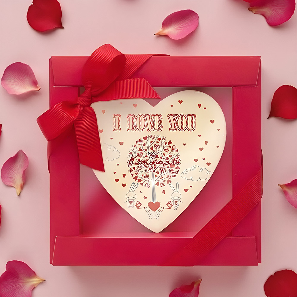 Этот нежнейший деликатес, украшенный красивым декором и упакованный в красную дизайнерскую коробку, имеет необычную форму: он изготовлен из белого шоколада в виде сердечка.