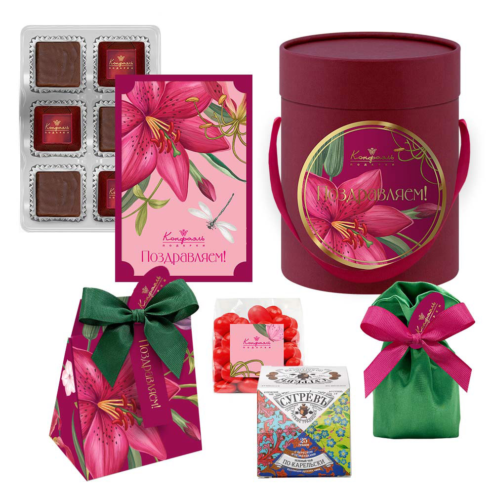 Поздравление 06/ Шоколадные конфеты «Ассорти» со сливочными начинками, конфеты «Суфле» в горьком шоколаде со вкусом «Игристого розе»/ 45г