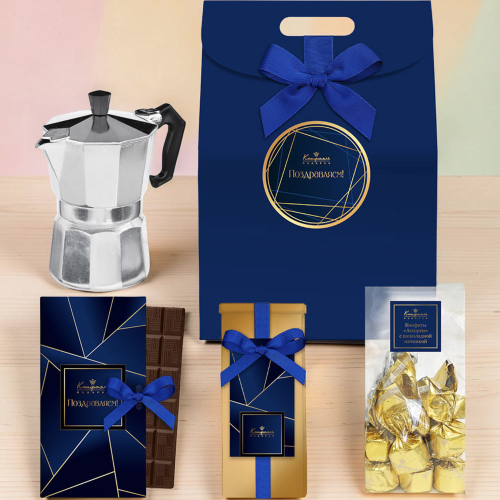 Подарочный набор: шоколад, кофе, кофеварка, ассорти (мужская синяя коллекция)