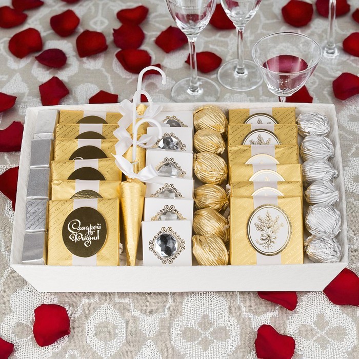 Преподнесите счастливым жениху и невесте в день их свадебного торжества подарочный набор в нарядной коробке - красивейшие и вкуснейшие конфеты из шоколада!