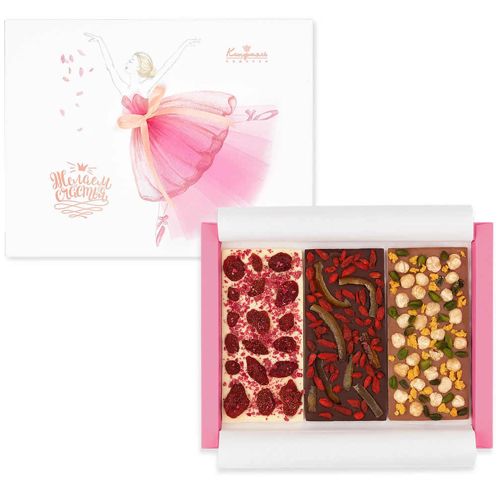 Шоколад горький с ягодами годжи и цукатами апельсиновых корочек, шоколад молочный с фундуком, фисташками и апельсиновыми кранчами, шоколад белый с клубникой и малиновыми кранчами