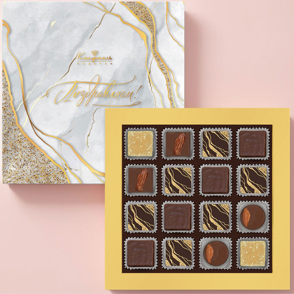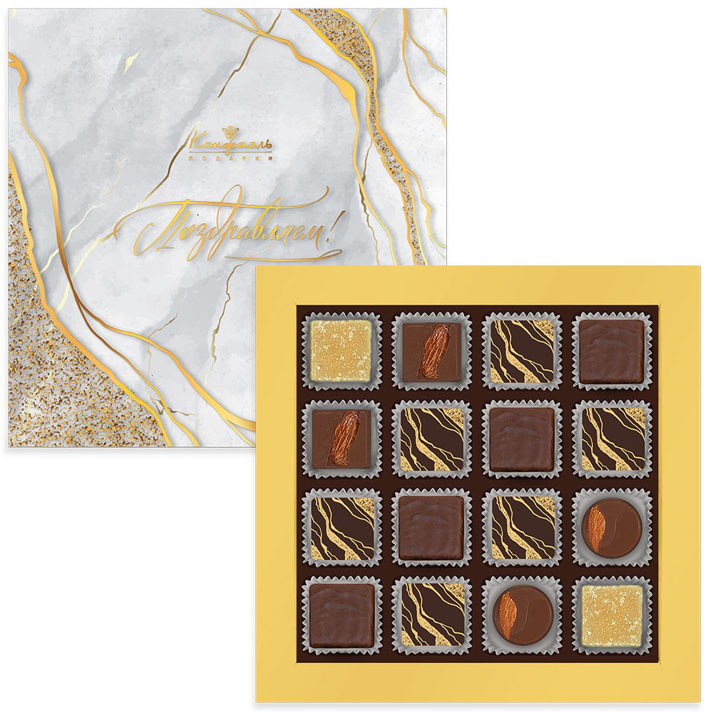 Состав: шоколадные массы - сахар, тертое какао, какао-порошок, масло какао, сыворотка молочная сухая, пахта сухая, эмульгатор (лецитин соевый); начинки - сахар, патока, какао-масло, какао тертое, молоко сгущенное (молоко цельное, сахар (сахароза, лактоза)), молоко сухое, масла растительные рафинированные дезодорированные (подсолнечное, рапсовое, оливковое; масло сливочное (из пастеризованных коровьих сливок), молоко сухое обезжиренное), масло сладко - сливочное, белок яичный порошкообразный, натуральный концентрированный апельсиновый сок, ядра орехов миндаля, желирующие агенты (агар, желатин говяжий), коньяк (дистиллят коньячный, вода, сахар, пищевой краситель "Карамельный колер»), спирт этиловый ректификованный, консервант (сорбиновая кислота), регулятор кислотности (лимонная кислота), экстракт ванили, эмульгаторы (лецитин соевый, Е471), ароматизаторы, пищевой краситель «Карамельный колер»; декор - пищевые красители (Е171, «Куркумин»). Продукция производится на предприятии, где используются арахис, кунжут, орехи, яичные и молочные продукты, злаки, содержащие глютен.