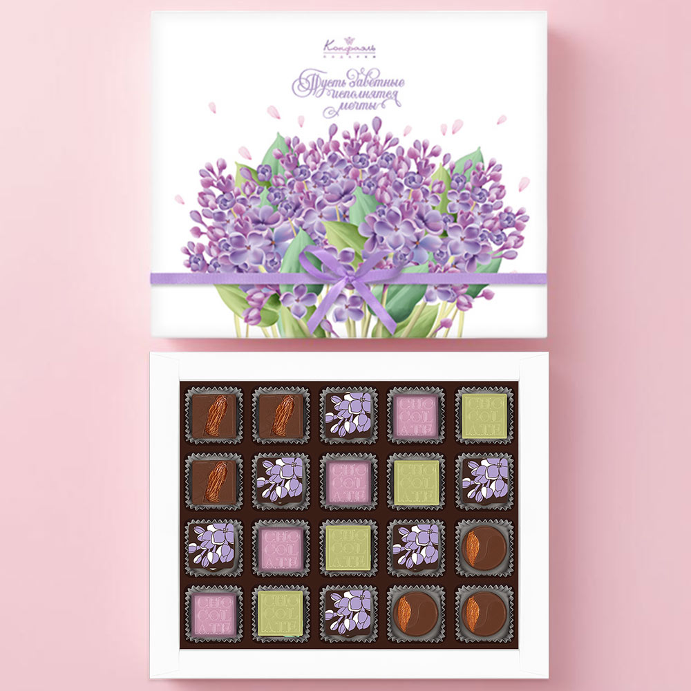 Состав: шоколадные массы - какао тертое, сахар, какао-порошок, какао-масло, сыворотка молочная сухая, молоко сухое цельное, молоко сухое обезжиренное, лактоза, эмульгатор (лецитин соевый), ароматизатор («Ванилин»); начинки - сахар, патока, молоко сгущенное (молоко цельное, сахар (сахароза, лактоза)), сливки сгущенные с сахаром (сливки нормализованные, сахар (сахароза), лактоза), масла растительные рафинированные дезодорированные (подсолнечное, рапсовое, оливковое; масло сладко-сливочное (из пастеризованных коровьих сливок), молоко сухое обезжиренное), натуральные концентрированные соки (черная смородина), ядра орехов миндаля, стабилизатор (мальтодекстрин, гуммиарабик), коньяк (дистиллят коньячный, вода, сахар, пищевой краситель «Карамельный колер»), спирт этиловый ректификованный, консервант (сорбиновая кислота), регулятор кислотности (лимонная кислота), эмульгаторы (лецитин соевый, Е471), экстракт лаванды, чай Матча, ароматизаторы, пищевые красители «Карамельный колер"; декор - пищевые красители (Е132, Е171, пищевой краситель (свекольный концентрат)).