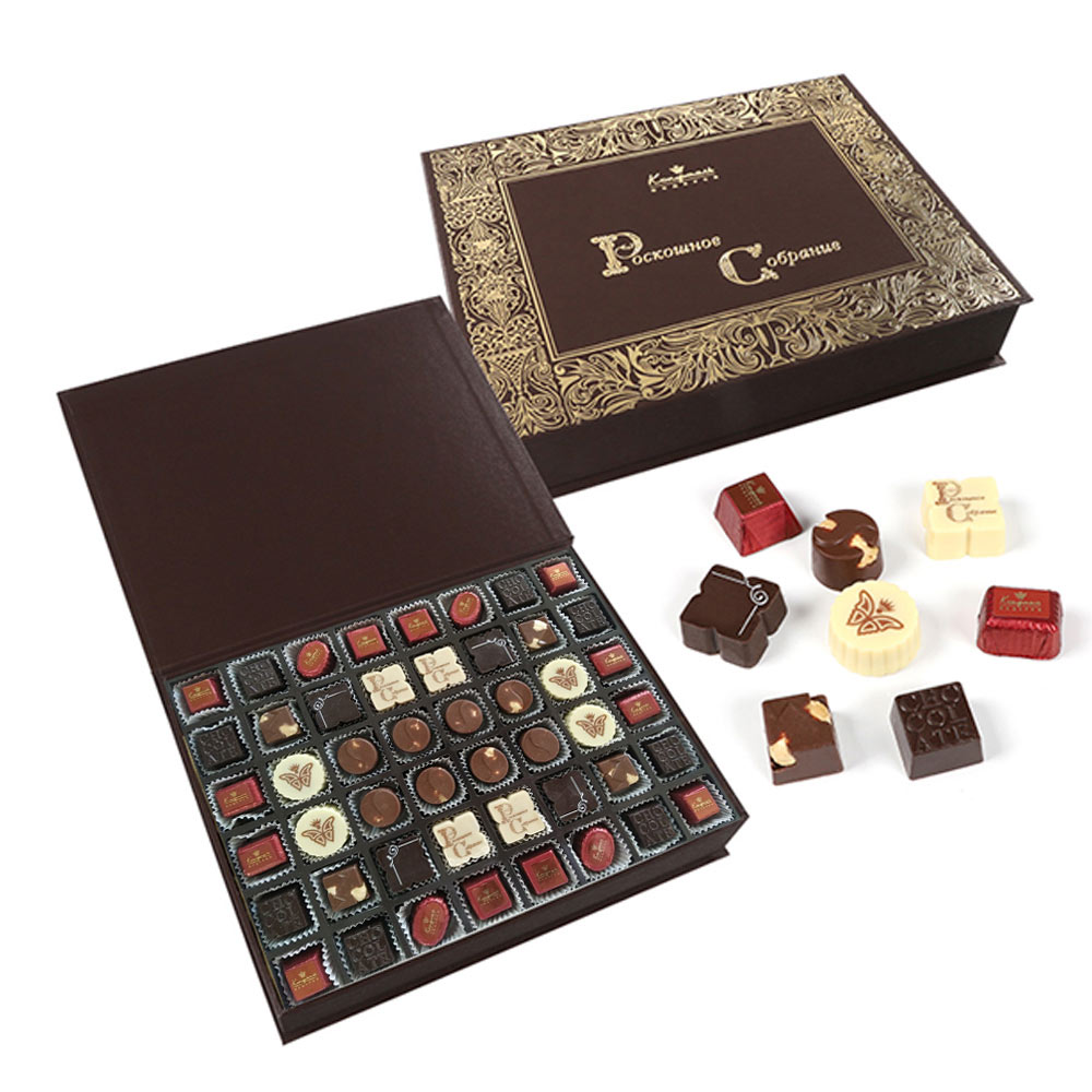 шоколадные массы – какао-масло, какао тертое, сахар, молоко сухое цельное, молоко сухое обезжиренное, лактоза, эмульгатор (лецитин соевый), ароматизатор («Ванилин»); начинки – сахар, патока, какао-масло, какао тертое, молоко сгущенное (молоко цельное, сахар (лактоза, сахароза)), молоко сухое, масло сладко-сливочное, рафинированные, дезодорированные, растительные масла, натуральные концентрированные соки, финики, чернослив, абрикос сушеный, ядра орехов фундука, ядра орехов миндаля, стабилизатор (мальтодекстрин), яичный белок, какао-порошок, желирующие агенты (агар, желатин), коньяк (дистиллят коньячный, вода, сахар, натуральный пищевой краситель «карамельный колер»), спирт этиловый ректификованный, яичный ликер, консервант (сорбиновая кислота), регулятор кислотности (лимонная кислота), эмульгаторы (лецитин соевый, Е471), натуральный экстракт ванили, натуральный экстракт кофе, ароматизаторы («Апельсин», «Вишня», «Земляника», «Яблоко», «Виноград», «Молочная карамель», «Кофе», «Бейлиз», «Клубника»), натуральный пищевой краситель «Карамельный колер»; декор – пищевые красители (Е100, Е120, Е132, Е171), глазирователь (капол)
