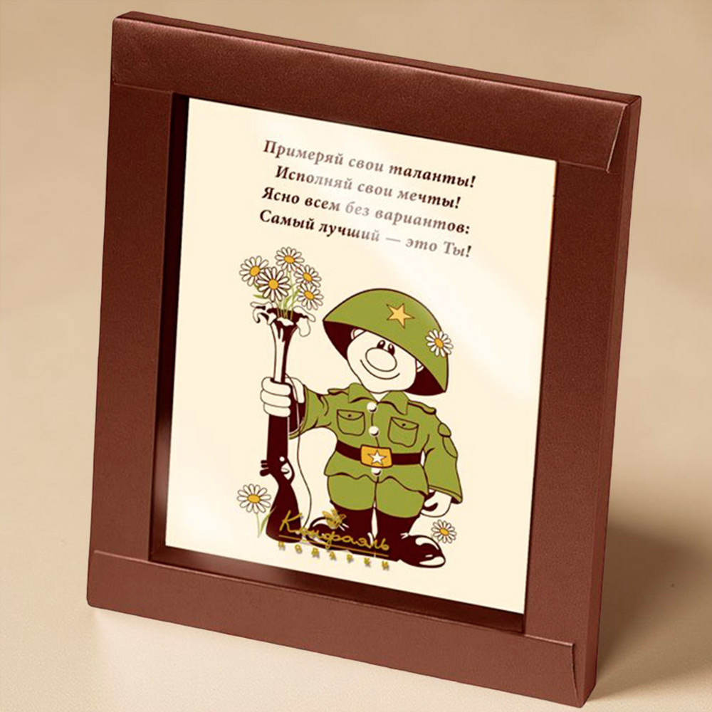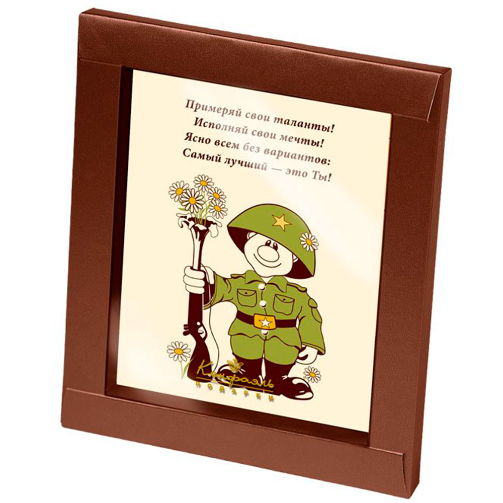 Защитникам Отечества по уставу положено сладенькое! А что может быть слаще шоколадной медали, подаренной любимыми людьми? Шоколадная открытка «С Днем Защитника Отечества» – очень трогательный и приятный подарок к 23 февраля. Вместо традиционных носков и пенки для бритья вручите шоколадную открытку– это залог того, что к 8 марта ваши мужчины позаботятся о не менее вкусном подарке.