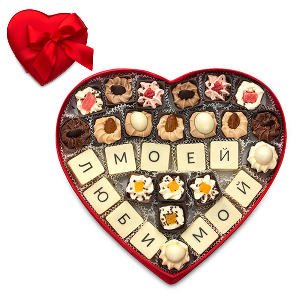 шоколадные массы – какао-масло, какао-тертое, сахар, молоко сухое цельное, молоко сухое обезжиренное, лактоза, эмульгатор (лецитин соевый), ароматизатор («Ванилин»); начинки – сахар, патока, фруктоза, какао-масло, какао тертое, молоко сгущенное (молоко цельное, сахар (сахароза, лактоза)), молоко сухое цельное, молоко сухое обезжиренное, рафинированные дезодорированные растительные масла, масло сладко-сливочное, натуральные концентрированные соки, клубника сублимированная,цукаты апельсиновых корочек, папайя сушеная, ядра орехов фундука, ядра орехов миндаля, фундук жареный тертый, какао-порошок, кофе натуральный молотый, стабилизатор (мальтодекстрин), лактоза, коньяк (дистиллят коньячный, вода, сахар, натуральный пищевой краситель «Карамельный колер»), спирт этиловый ректификованный, консервант (сорбиновая кислота), эмульгаторы (лецитин соевый, Е471), ароматизаторы («Апельсин», «Ваниль», «Ванилин», «Земляника», «Миндаль», «Кофе», «Кокосовые сливки»), натуральный пищевой краситель «Карамельный колер», декор – пищевые красители (куркумин, Е132, Е171), пищевой краситель (концентрированный сок красной редиски, масло подсолнечное, эмульгаторы (мальтодекстрин, Е472с), регуляторы кислотности (лимонная кислота, аскорбиновая кислота)).