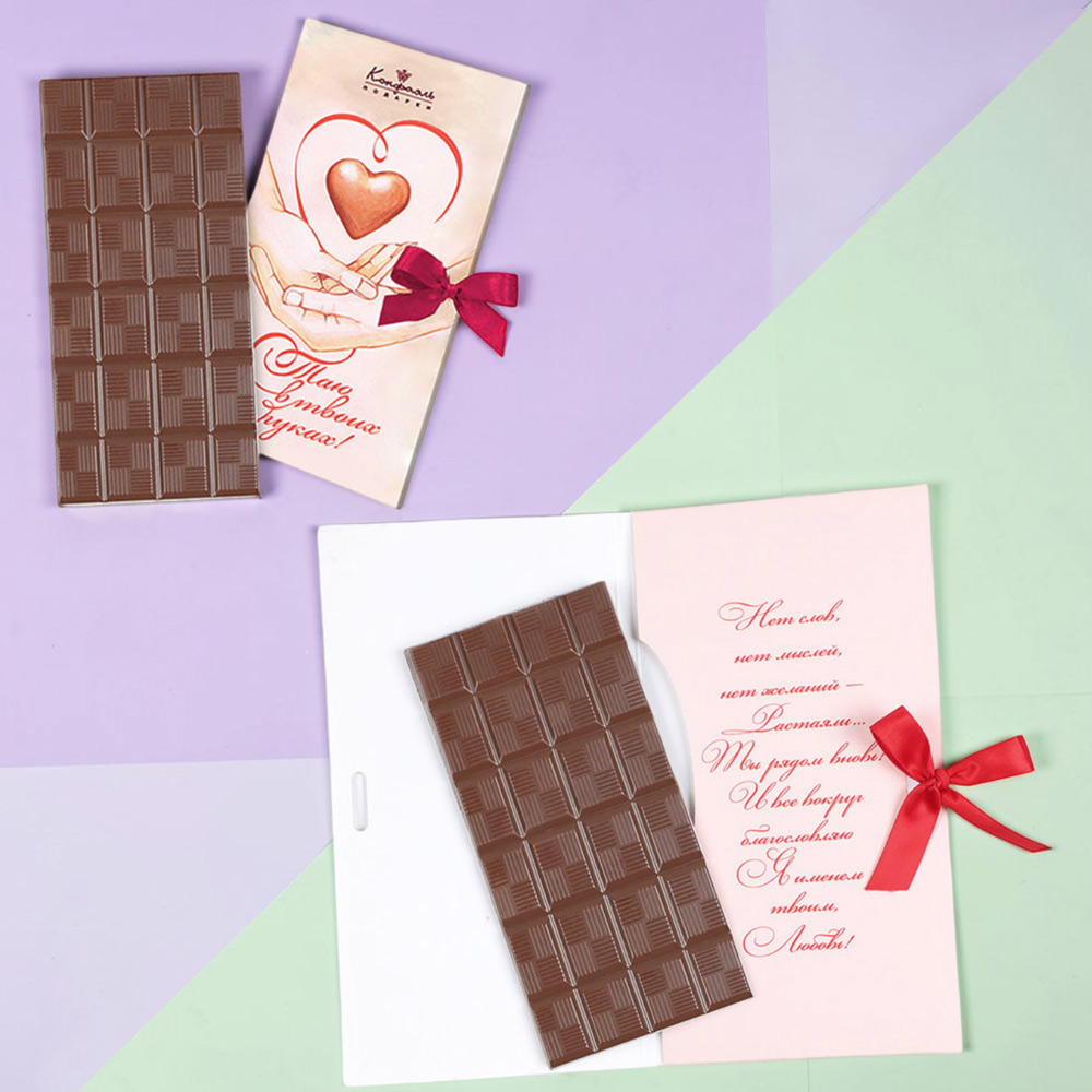 Отчаялись найти подарок ко Дню Святого Валентина, который лучше всяких слов расскажет о ваших чувствах? Шоколадная открытка - очень символичный подарок станет красивым сувениром для близкого человека и безмолвным признанием в своей страстной любви и глубокой привязанности к нему. Терпкий вкус превосходного шоколада от «Конфаэль», романтический ужин при свечах только для вас двоих сделает праздничный вечер незабываемым.