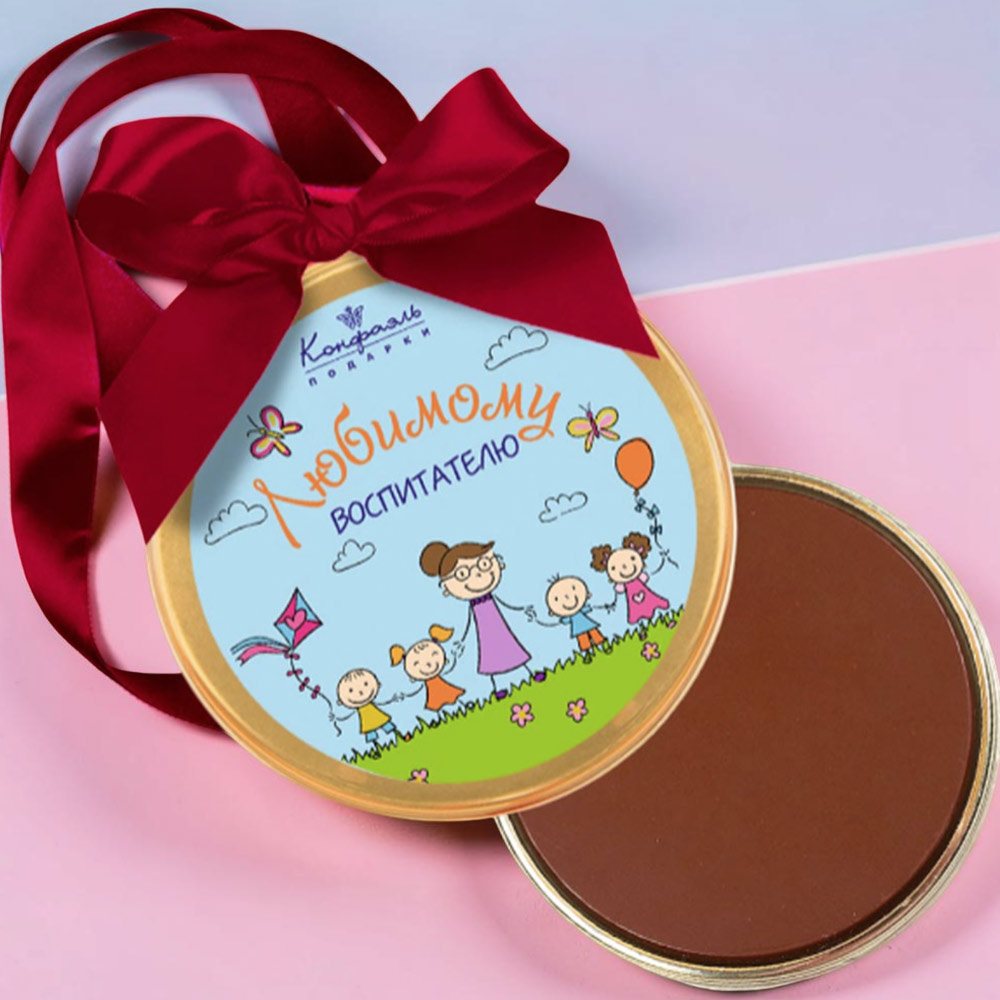 Кондитеры компании «Конфаэль» специально для такого случая изготовили из натурального шоколада эксклюзивную медаль «Любимому воспитателю».