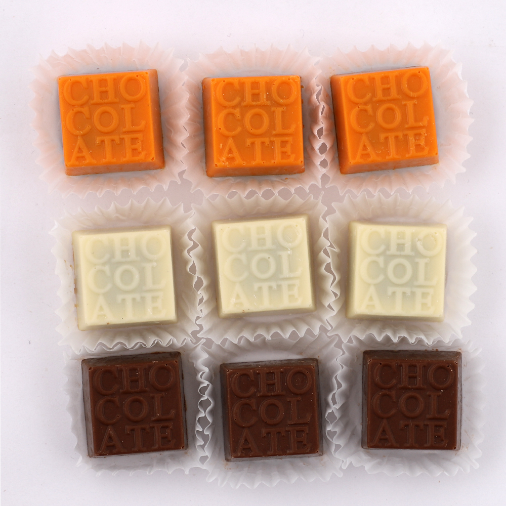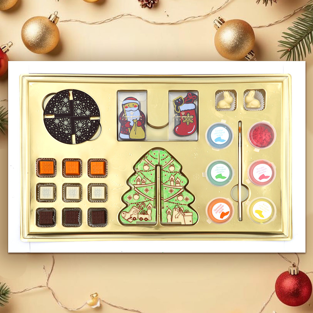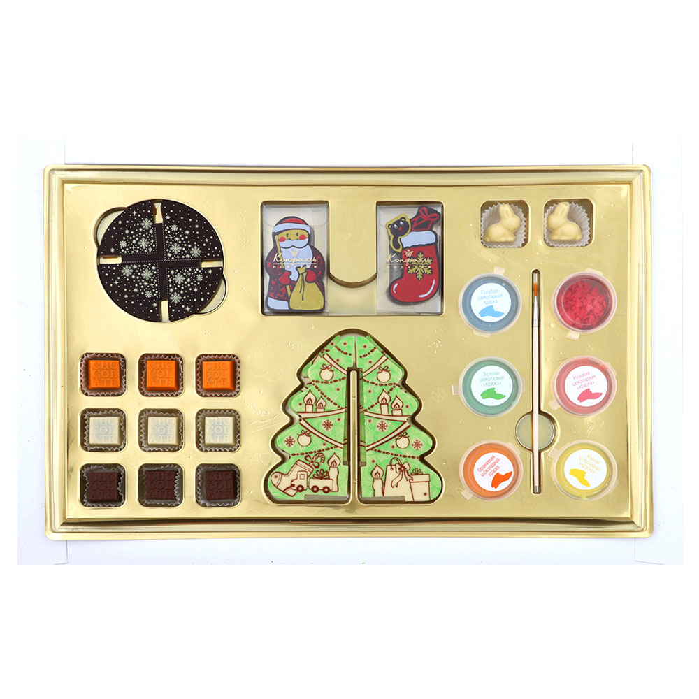 Состав: шоколадные массы - сахар, тертое какао, масло какао, сыворотка молочная сухая, пахта сухая, сухое цельное молоко, сухое обезжиренное молоко, эмульгатор (лецитин соевый), соль, натуральная ваниль, куркума молотая, клубника сушеная, яблоко сушеное; начинки - сахар, патока, масло какао, тертое какао, молоко сгущенное (молоко цельное, сахар (сахароза, лактоза)), молоко сухое цельное, молоко сухое обезжиренное, масла растительные рафинированные дезодорированные (подсолнечное, рапсовое, оливковое; масло сливочное, молоко сухое обезжиренное), жир специального назначения (масло ши, рапсовое масло, соевое масло), сухие молочные продукты, стабилизатор (мальтодекстрин), коньяк (дистиллят коньячный, вода, сахар, пищевой краситель "Карамельный колер"), спирт этиловый ректификованный, экстракт маракуйи, консервант (сорбиновая кислота), регулятор кислотности (лимонная кислота), эмульгаторы (лецитин соевый, Е471), ароматизаторы, пищевой краситель "Карамельный колер"; декор - пищевые красители (Е132, Е171, Е172, "Куркумин", свекольный концентрат), комплекс меднохлорофиллов.