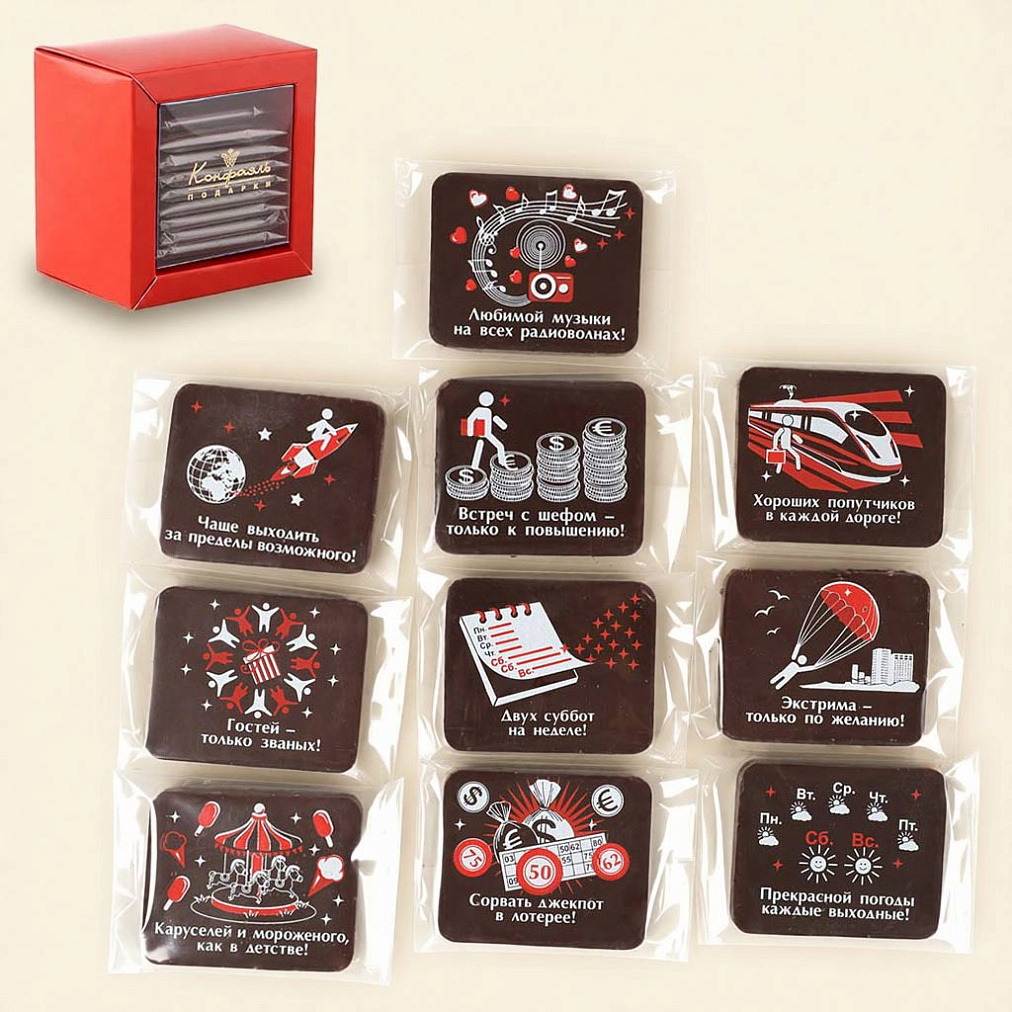 Вкусный десерт, изготовленный из лучшего горького шоколада, подарит солидную порцию эндорфинов, а весёлые, задорные пожелания, нанесённые на каждую плитку, заставят улыбнуться любого.