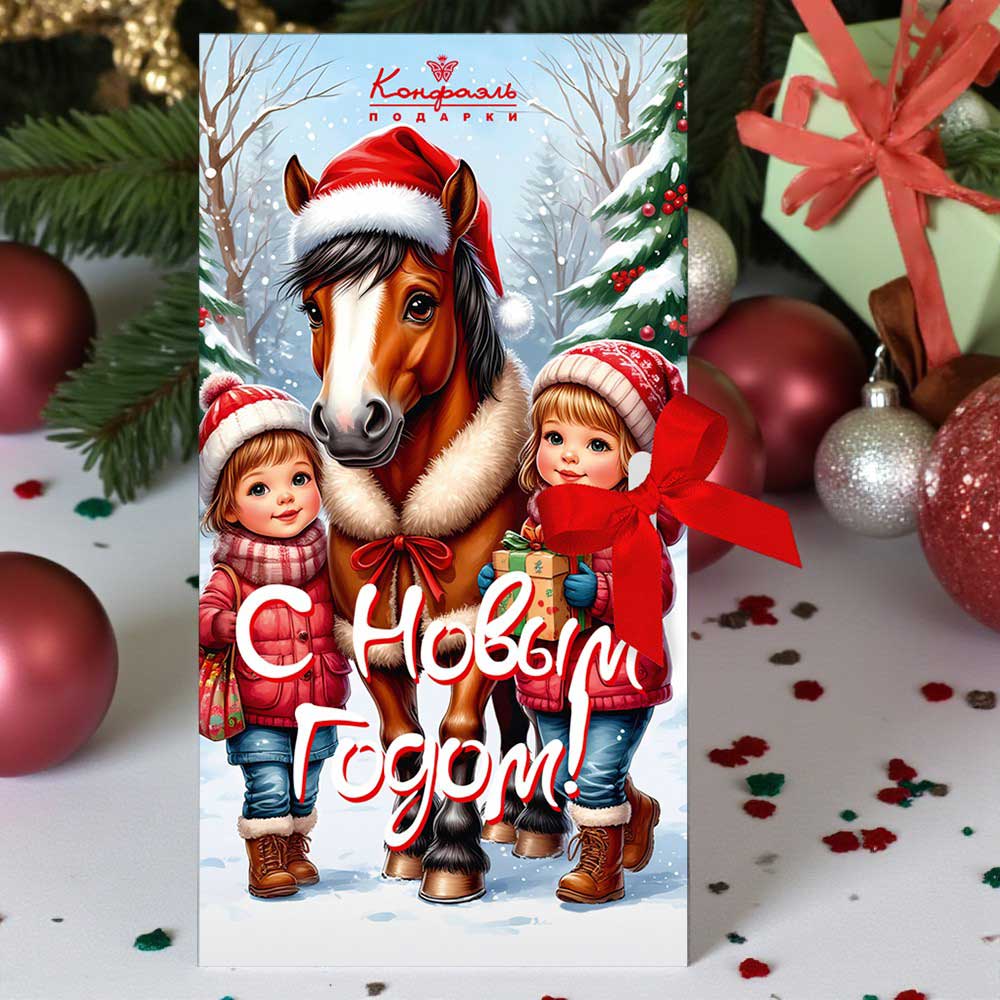 Чтобы добавить ярких впечатлений своим любимым и близким, предлагаем оригинальный подарок — шоколадную открытку «Символ года 2026» из натурального молочного шоколада.