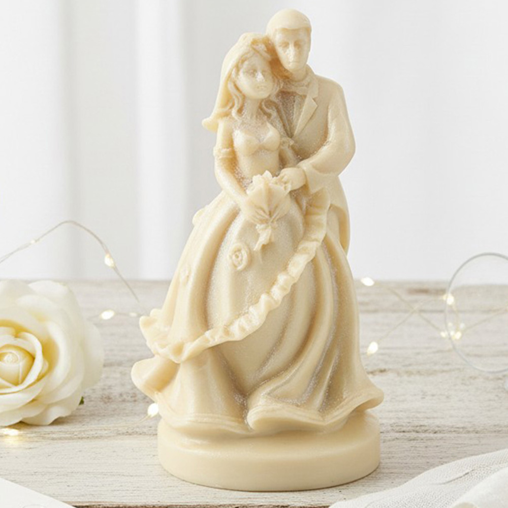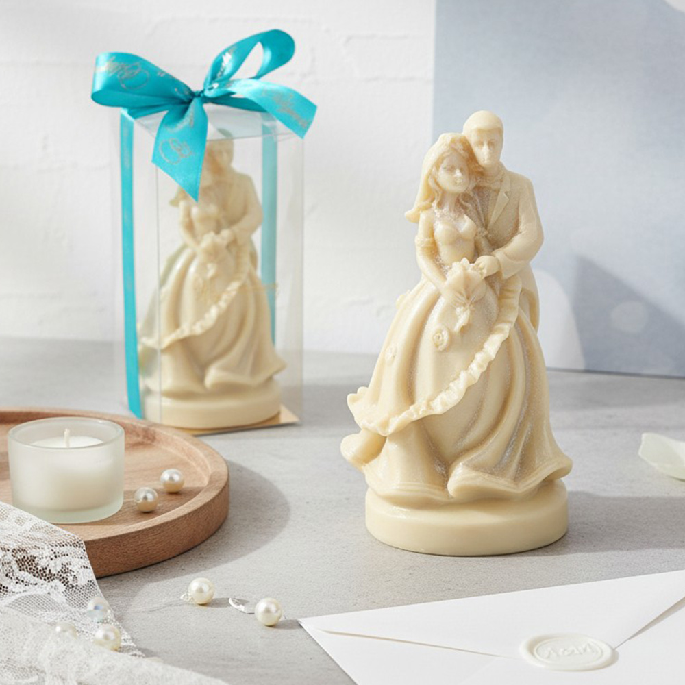 Их запечатленные в белом шоколаде образы вы можете как преподнести в виде подарка на праздник, так и сделать частью торжества, украсив стол брачующихся.