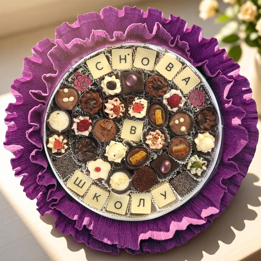 Набор необыкновенно вкусных лакомств - желейного мармелада и конфет из элитного настоящего шоколада - в виде нарядного букета «Снова в школу».
