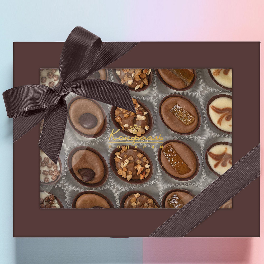 Состав: шоколад – сахар, какао тёртое, масло какао, эмульгатор (лецитин соевый), ароматизатор; начинки – сахар, какао-масло, молоко сухое обезжиренное, масла растительные рафинированные дезодорированные (подсолнечное, рапсовое, оливковое; масло сливочное (из пастеризованных коровьих сливок), молоко сухое обезжиренное), паста из кофе (кофе, растительный жир), рис воздушный с какао (крупа рисовая, сахар, какао, соль), цукаты апельсиновых корочек, апельсин сушеный, кофе натуральный молотый, эмульгаторы (лецитин соевый, Е471), ароматизаторы. Продукция производится на предприятии, где используются арахис, кунжут, орехи, яичные и молочные продукты, злаки, содержащие глютен.