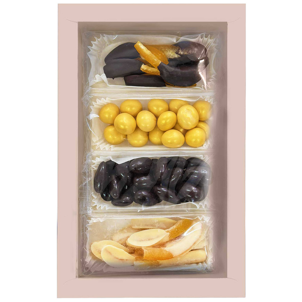 Драже "Ананас" в белом шоколаде с декором, "Миндаль" в молочном шоколаде, конфеты глазированные молочным шоколадом "Цукаты" (апельсиновые корочки), конфеты глазированные белым шоколадом "Цукаты" (апельсиновые корочки)