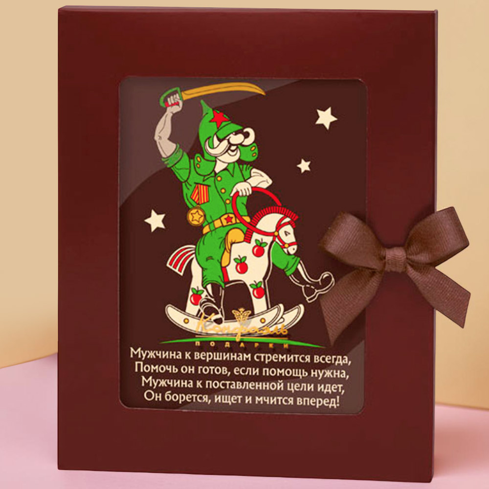 А что может быть слаще шоколадной медали, подаренной любимыми людьми? Шоколадная открытка «С Днем Защитника Отечества» – очень трогательный и приятный подарок к 23 февраля.