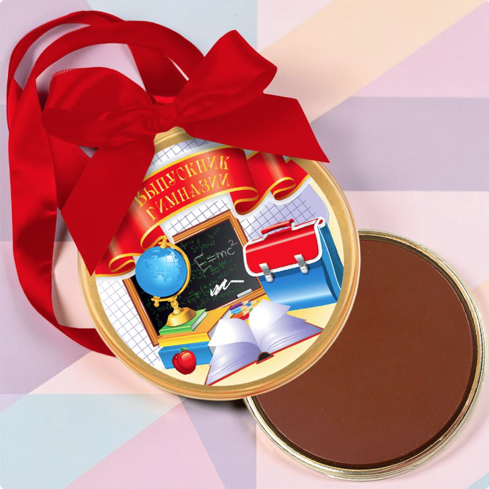 Сверкающая медаль "Выпускник гимназии", изготовленная из шоколада, подчеркнёт важность события - окончания гимназии - и подсластит горечь расставания с прошлым.