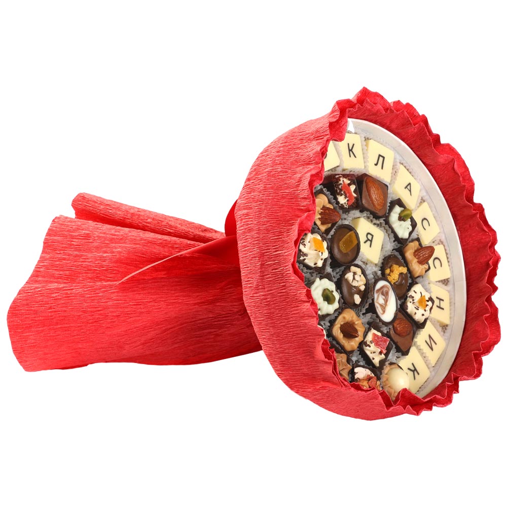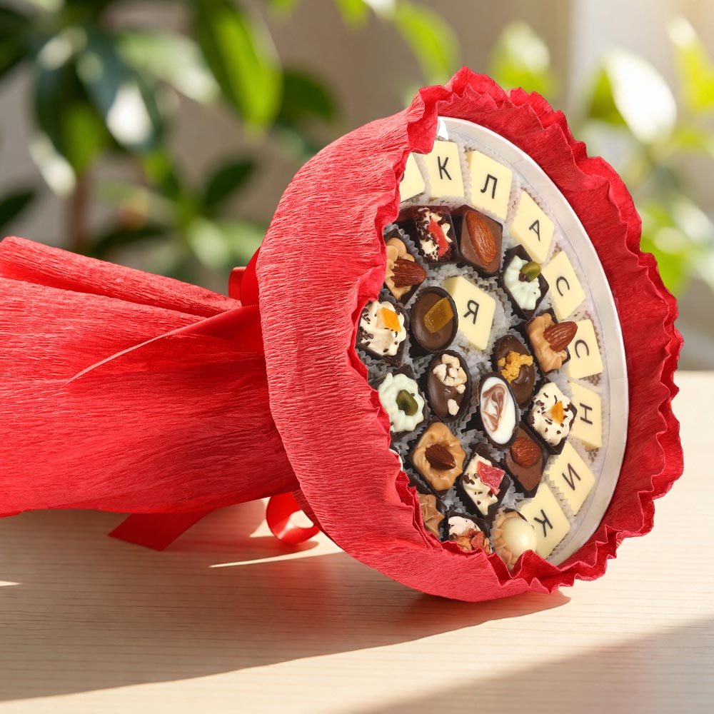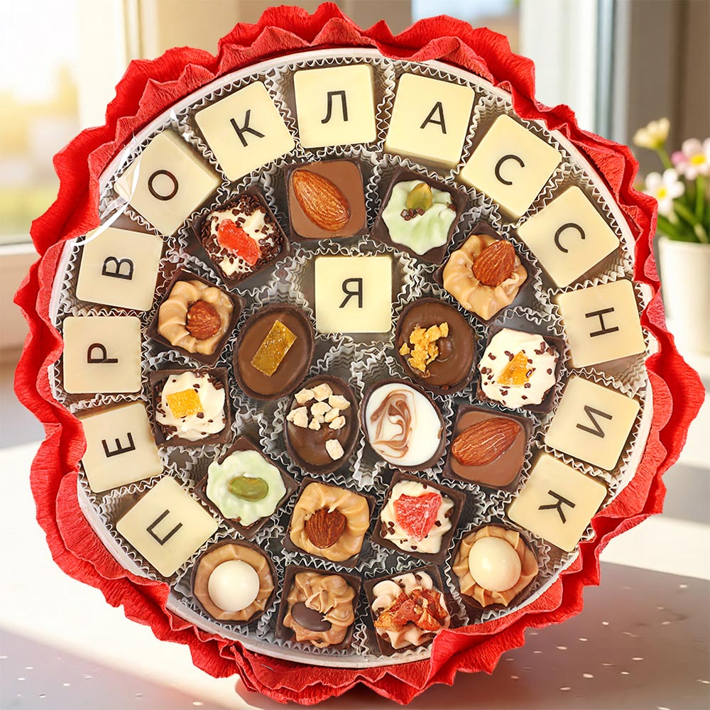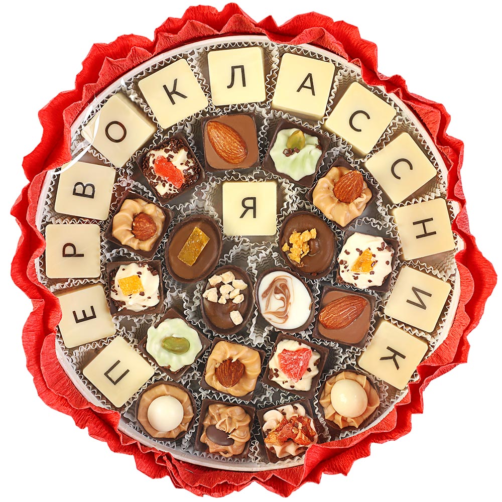 И лучший подарок для него в День знаний — великолепный, ни с чем несравнимый букет сладостей из элитного шоколада с нежнейшим вкусом сливочной начинки.